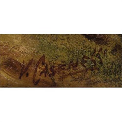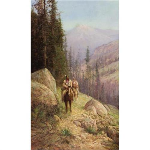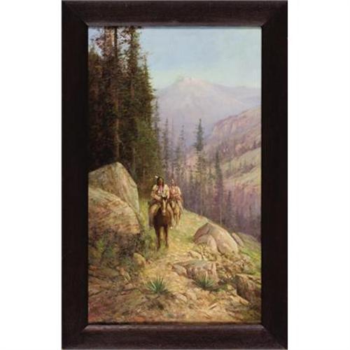<B>VICTOR CASENELLI (American, 1867-1961)</B></I><BR><I>Two Indians on Horseback</B></I><BR>Oil on canvas<BR>34 x 20 inches (86.4 x 50.8 cm)<BR>Signed lower right: <I>V. Casenelli</B></I><BR> <B>Condition Report:</B> Original canvas, good condition.<BR><BR><b>Shipping:</b> Framed - without Glass, Medium (<a target="_blank" href="http://www.heritageauctions.com/common/shipping.php">view shipping information</a>)