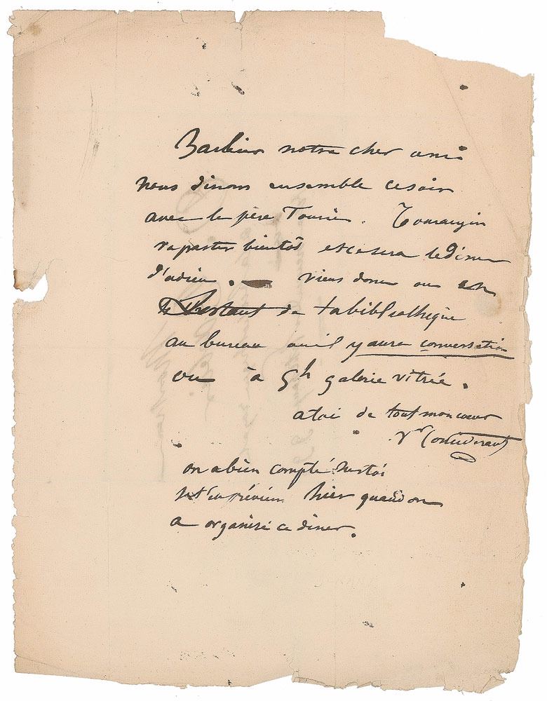 French utopian socialist (1808–1893) who founded the European Society for the Colonization of Texas and wrote two books, Au Texas and The Great West; he founded Texas colony La Reunion in 1855 based on Charles Fourier's socialist principles. ALS in French, signed “V'r Considerant,” one page, 7 x 9, no date. Letter to Mr. Barbier, in part (translated): "We're having dinner together tonight with pere Fourier." In very good to fine condition, with paper loss to edges and show-through from address to reverse.