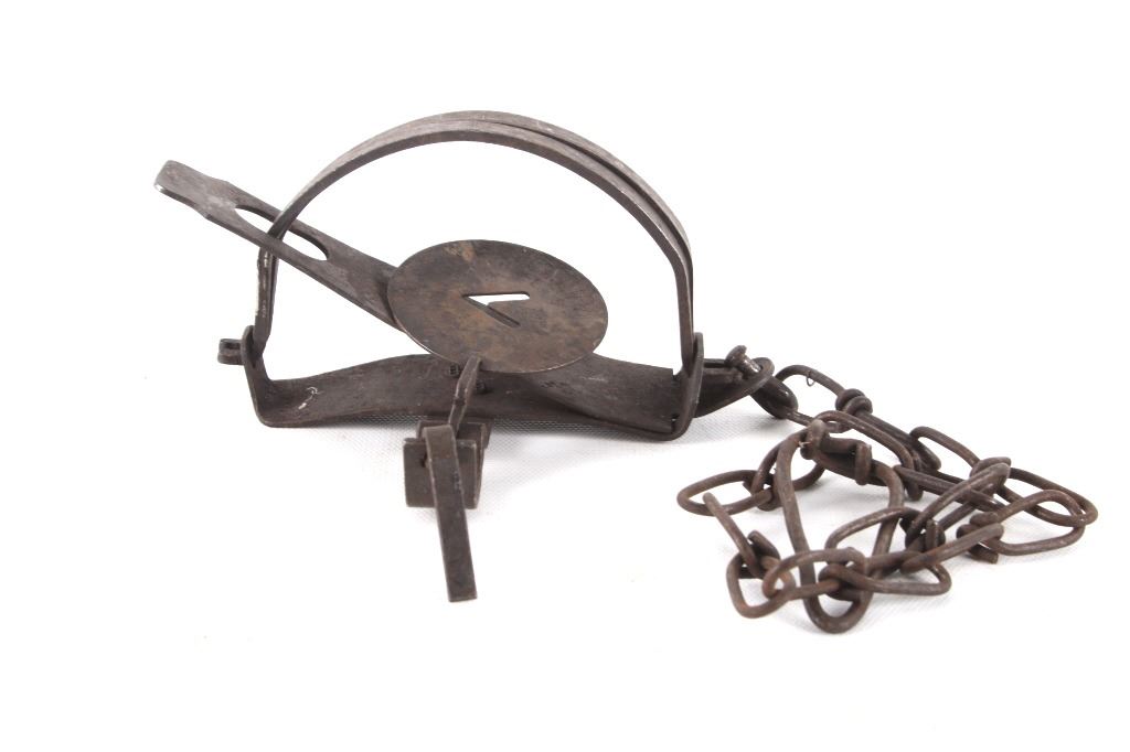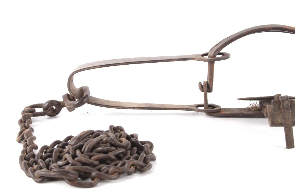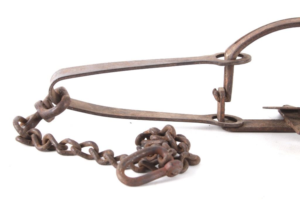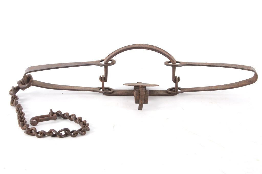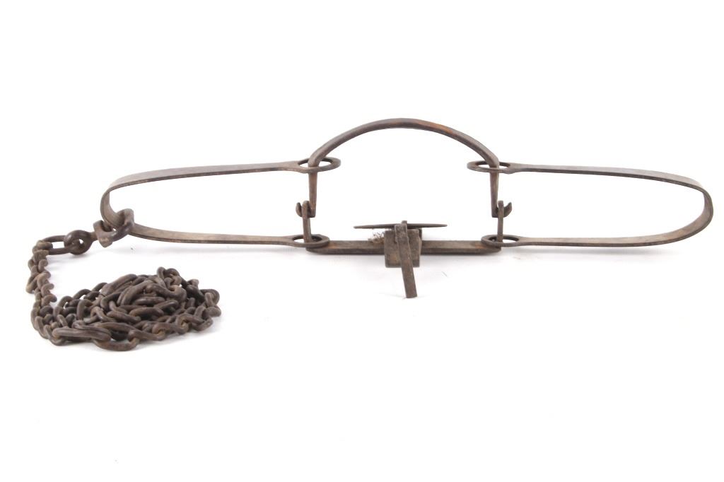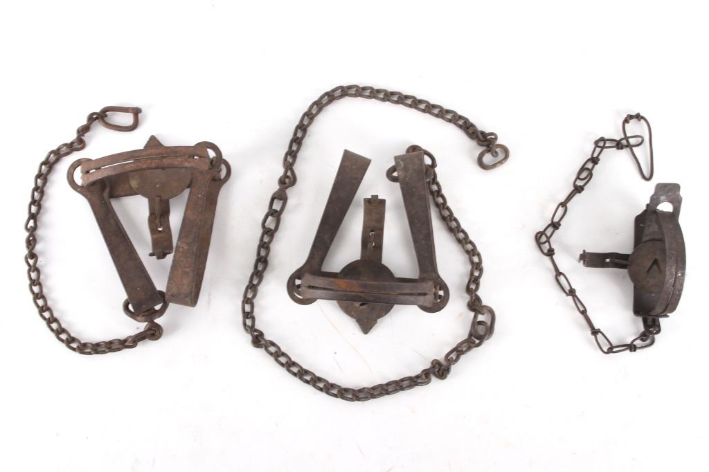Featured in this lot is this collection of Victor coyote traps and an Oneida jump trap from a Big Timber collection. There are three traps in this collection. The first is a Victor #3 coyote trap with a fine patina. The second is a Victor #3 trap with a heavier patina and smaller anchor chain. The last is a Victor Oneida #1 1/2 and is a jump trap design. The condition of this collection of traps is good, with no obvious signs of damage; they are in good overall working condition. The measurements of these traps are 3 3/4" x 16 1/2" x 5 1/2" and 4" x 17" x 5 1/2" and 3" x 6 1/4" x 4 1/4".