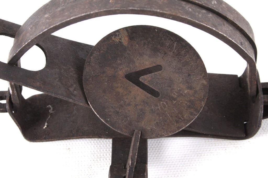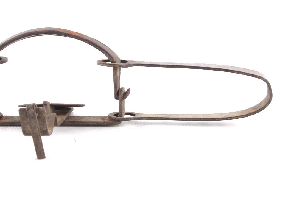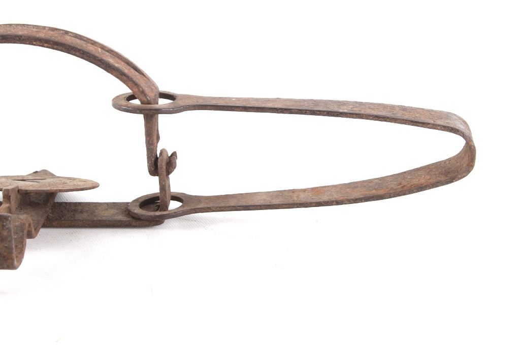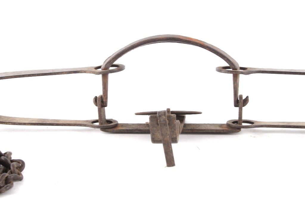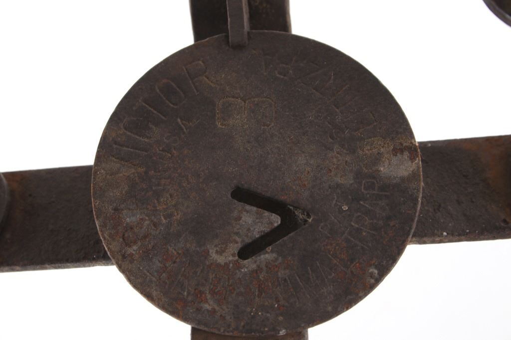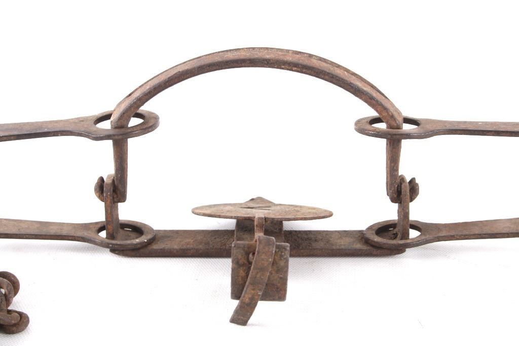Featured in this lot is this collection of Victor coyote traps and an Oneida jump trap from a Big Timber collection. There are three traps in this collection. The first is a Victor #3 coyote trap with a fine patina. The second is a Victor #3 trap with a heavier patina and smaller anchor chain. The last is a Victor Oneida #1 1/2 and is a jump trap design. The condition of this collection of traps is good, with no obvious signs of damage; they are in good overall working condition. The measurements of these traps are 3 3/4" x 16 1/2" x 5 1/2" and 4" x 17" x 5 1/2" and 3" x 6 1/4" x 4 1/4".