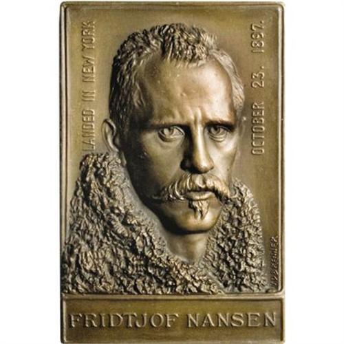 <B>Victor D. Brenner-Designed Fridtjof Nansen Plaquette.</B></I> Bronze, uniface, 44 mm x 68 mm. High-relief, well executed portrait of the Norwegian explorer-diplomat. Nameplate with FRIDTJOF NANSEN below, at sides LANDED IN NEW YORK OCTOBER 23, 1897. Signed V.D.BRENNER. (The slanted middle stroke on the B, seen here and on other Brenner pieces in this sale, is characteristic of the Brenner signature and an aid in identifying genuine 1909 VDB and 1909-S VDB cents.) As struck, with pleasing tan-gold surfaces.<BR><BR><b>Shipping:</b> Coins & Currency (<a target="_blank" href="http://www.heritageauctions.com/common/shipping.php">view shipping information</a>)