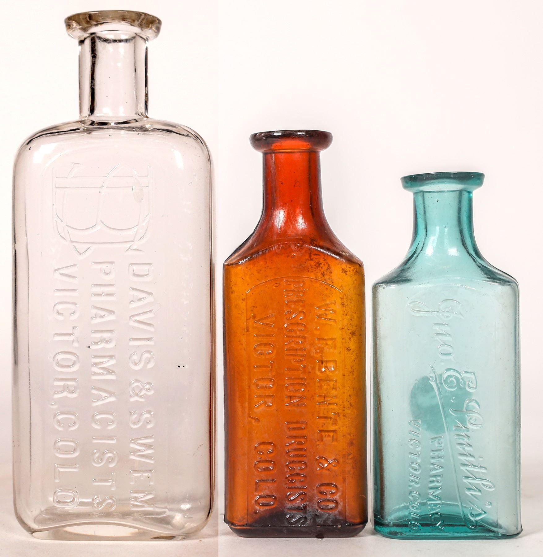3 bottles + 2 Letterheads. 1.) Davis & Swem Clear 6" tall, problem free. 2.) Bente Amber 4 5/8" stain 3.) Don Smith light teal 4 1/8" minor stain 4.) Victor Drug billhead 19xx 5.) Schultz and Mcclellan billhead 1896. Ron Reed Collection