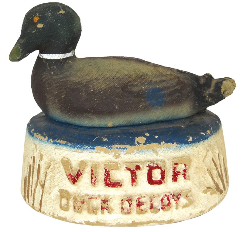 Victor Duck Decoys figural advertising display, painted papier-mâché duck on pond, very unusual, VG