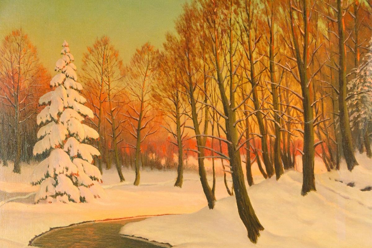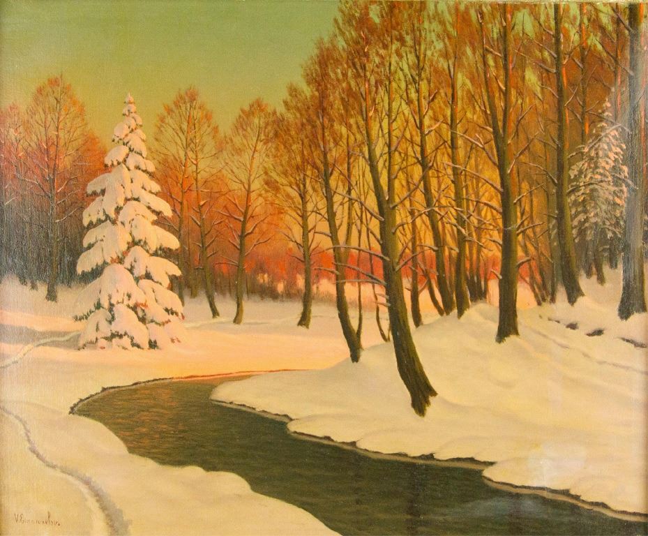 Sunrise over a winter woodland landscape; oil on canvas; framed; signed V. Emanuelov on lower left; 62 cm x 72 cm