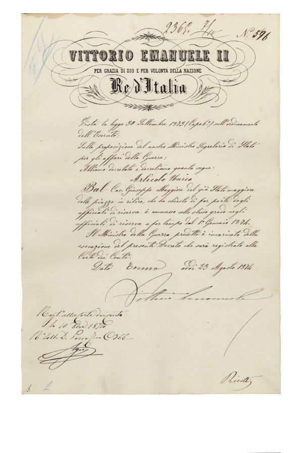 VICTOR EMMANUEL II (1820-1878) King of Italy. Partially Printed Document, in Italian, Signed “Vittorio Emanuele.” One page, 9 3/4” x 14 1/4”. Turin. August 23, 1874. Slight staining at top edge. File holes at left edge. Else Fine.