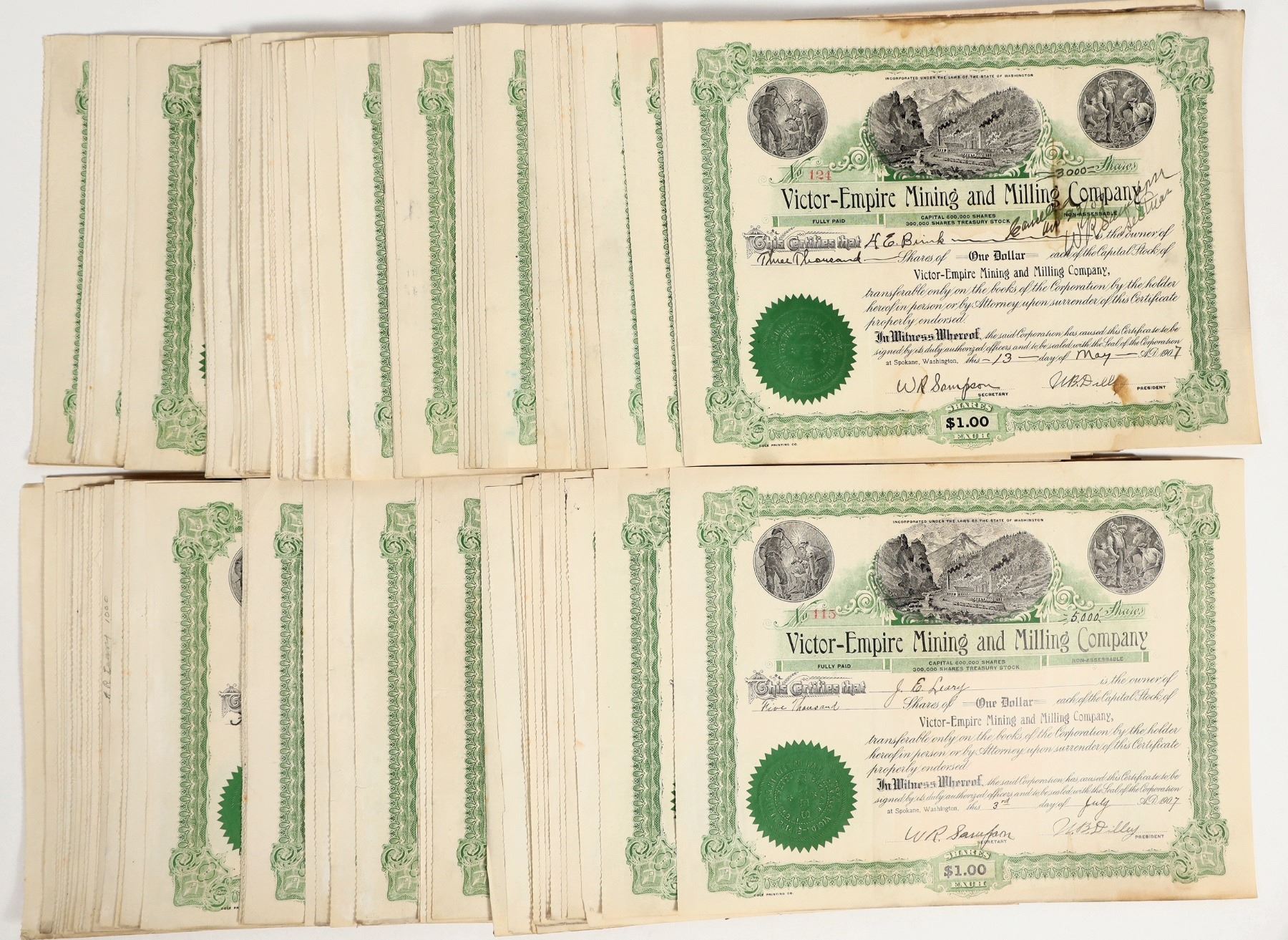 About 120 Victor-Empire Mining and Milling Co. Stocks c. 1907-10. Issued, many endorsed on reverse. See photos. Somewhat rare.