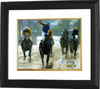 American Pharoah won the American Triple Crown in 2015. He is bred and owned by Ahmed Zayat of Zayat Stables, LLC, trained by Bob Baffert and ridden in most of his races by Victor Espinoza. He is the first American Triple Crown winner since Affirmed in 1978 and only the twelfth in history. American Pharoah won the 2015 Kentucky Derby and 2015 Preakness Stakes. He won the Triple Crown in a wire-to-wire victory at the Belmont Stakes with his time the second-fastest for a Triple Crown winner and his closing quarter-mile time of 24.32 was actually faster than Secretariat's.Victor Espinoza has hand signed this 11x14 Photo on American Pharoah from the Preakness. Steiner Sports Hologram and Certificate of Authenticity. Custom White Mat and Premium Black Color Framed as shown.
