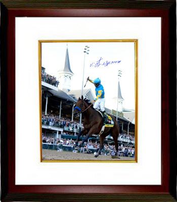 American Pharoah won the American Triple Crown in 2015. He is bred and owned by Ahmed Zayat of Zayat Stables, LLC, trained by Bob Baffert and ridden in most of his races by Victor Espinoza. He is the first American Triple Crown winner since Affirmed in 1978 and only the twelfth in history. American Pharoah won the 2015 Kentucky Derby and 2015 Preakness Stakes. He won the Triple Crown in a wire-to-wire victory at the Belmont Stakes with his time the second-fastest for a Triple Crown winner and his closing quarter-mile time of 24.32 was actually faster than Secretariat's.Victor Espinoza has hand signed this 8X10 Photo on American Pharoah from the Kentucky Derby. Steiner Sports Hologram and Certificate of Authenticity. Custom White Mat and Premium Mahogany Frame as shown.