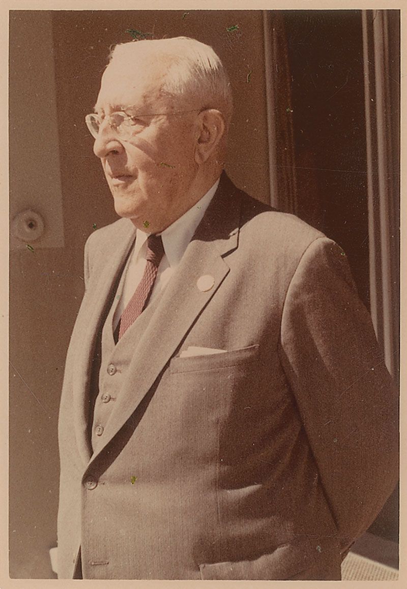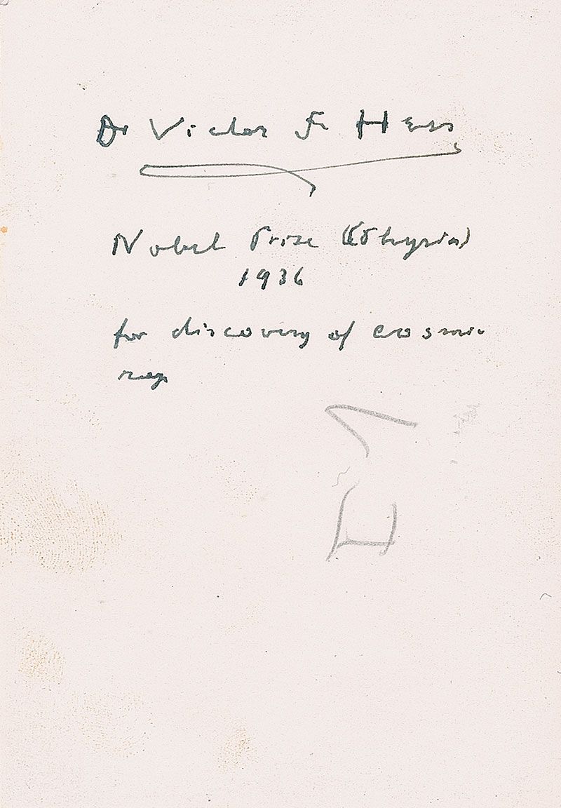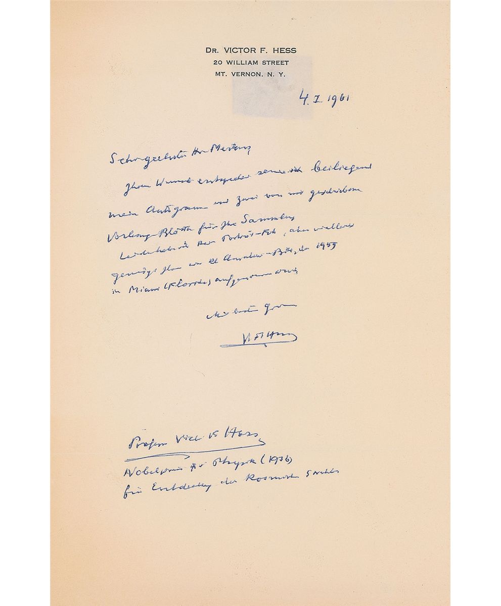Two items: an ALS in German signed “V. F. Hess,” one page, personal letterhead, January 4, 1961, responding to an autograph request; and a color glossy 2.75 x 4 candid photo of Hess, signed on the reverse, “Dr. Victor F. Hess, Nobel Prize for Physics, 1936, for discovery of cosmic ray.” In overall fine condition, with light toning to the letter.