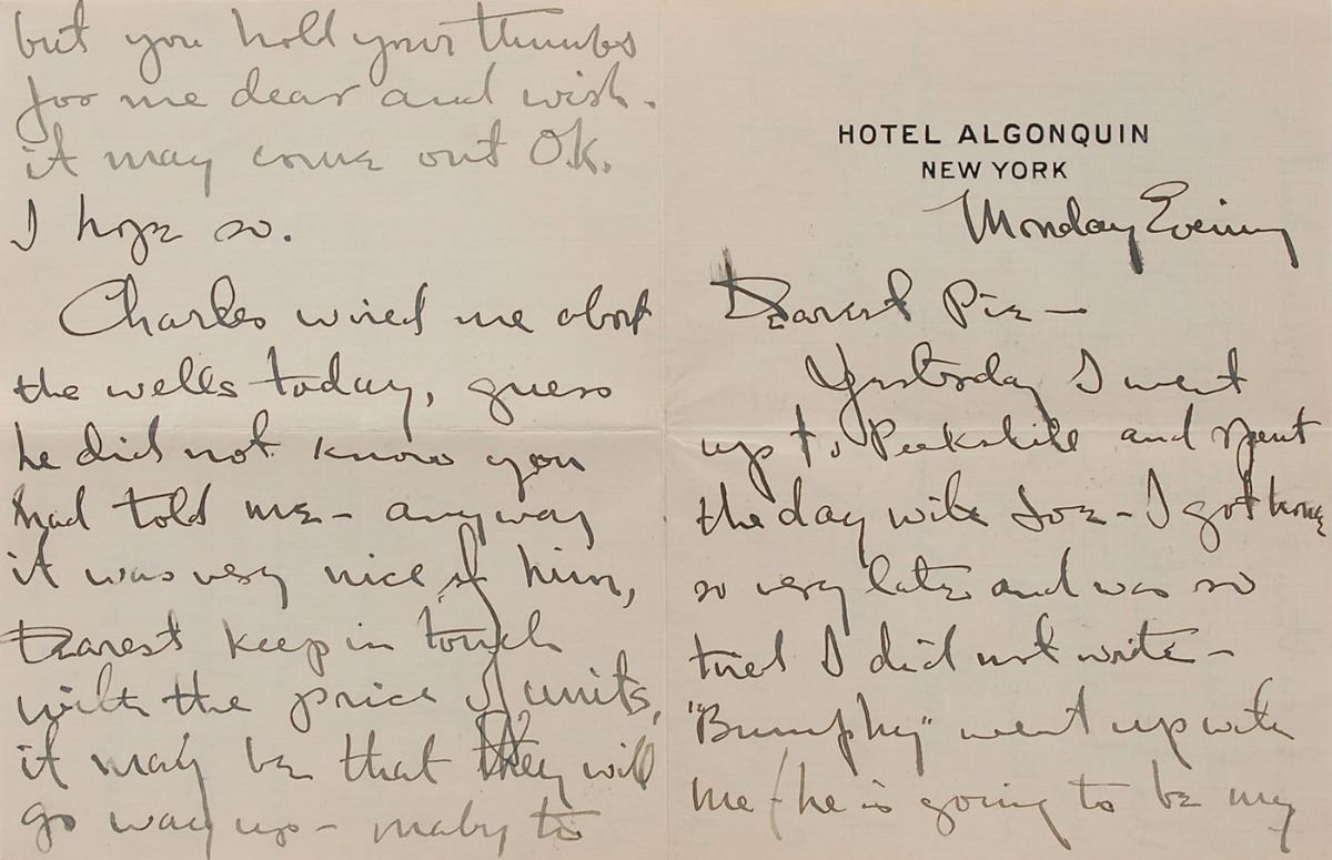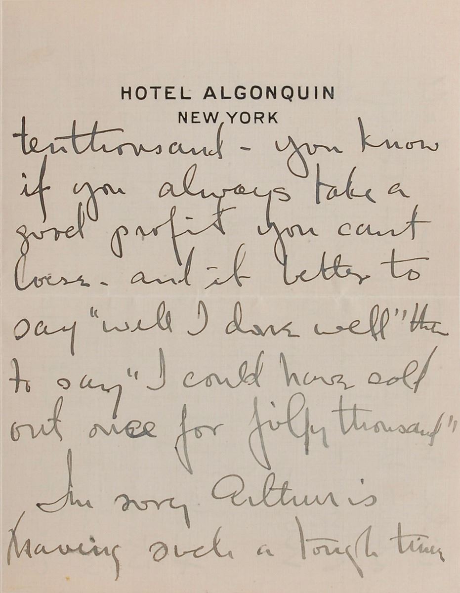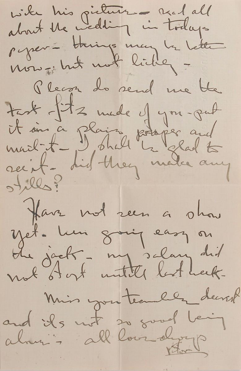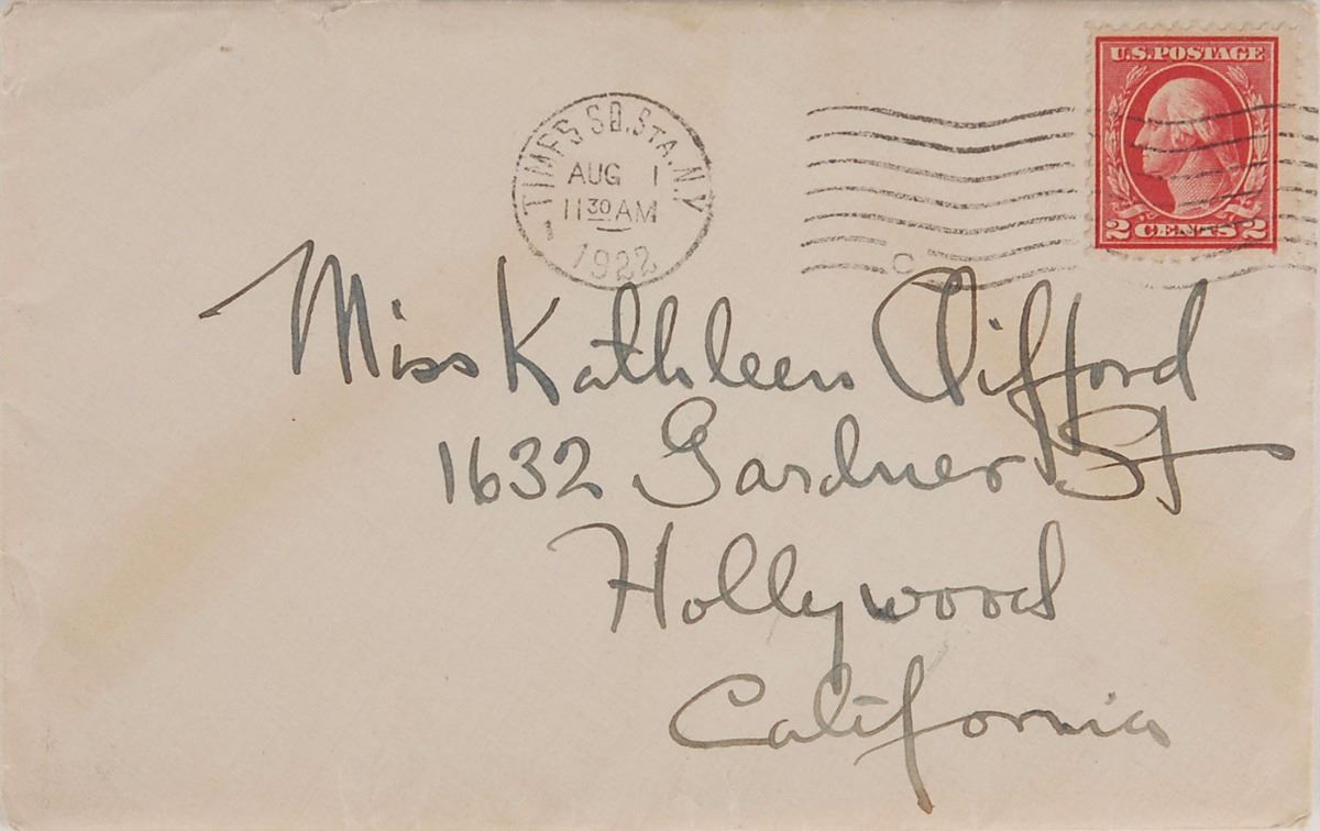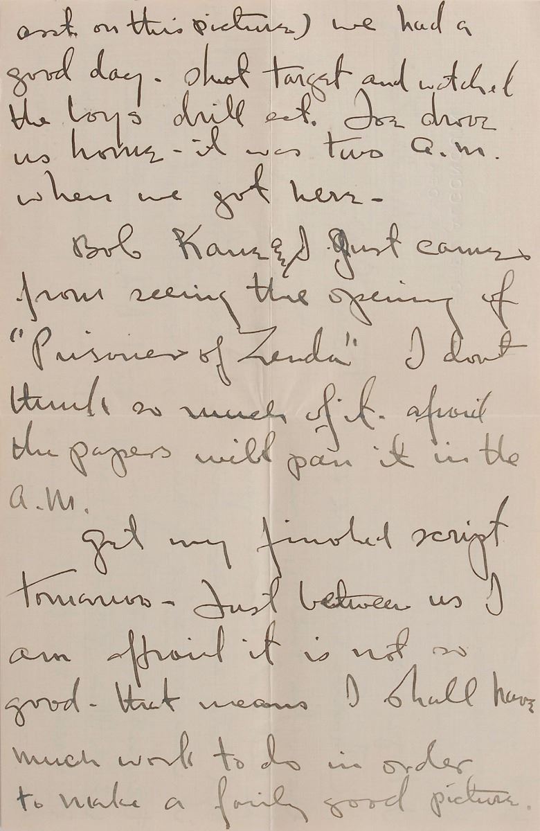 ALS signed “Victor,” seven pages two sets of adjoining sheets, 5 x 6.5, Hotel Algonquin letterhead, postmarked August 1, 1922. Letter to actress Kathleen Clifford, in part: “We had a good day, shot target and watched the boys drill…Bob Kane and I just came from seeing the opening of ‘Prisoner of Zenda.’ I don’t think so much of it, afraid the papers will pan it in the a.m. Get my finished script tomorrow—just between us I am afraid it is not so good—that means I shall have much work to do in order to make a good picture, but you hold your thumbs for me dear and with—it may come out OK. I hope so…I’m sorry Arthur is having such a tough time with his picture—read all about the wedding in today’s papers—things may be better now—but not likely. Please do send me the test Fitz made of you…I shall be glad to see it—did they make any stills? Have not seen a show yet…My salary did not start until last week.” In fine condition. Accompanied by the original mailing envelope addressed in his own hand. Accompanied by a reprint photo. Though he was a cinematographer on several films throughout the 1910s, Fleming did not make his directorial debut until 1919, and at the time of writing had just six director’s credits to his name. A very early letter with excellent cinematic content.