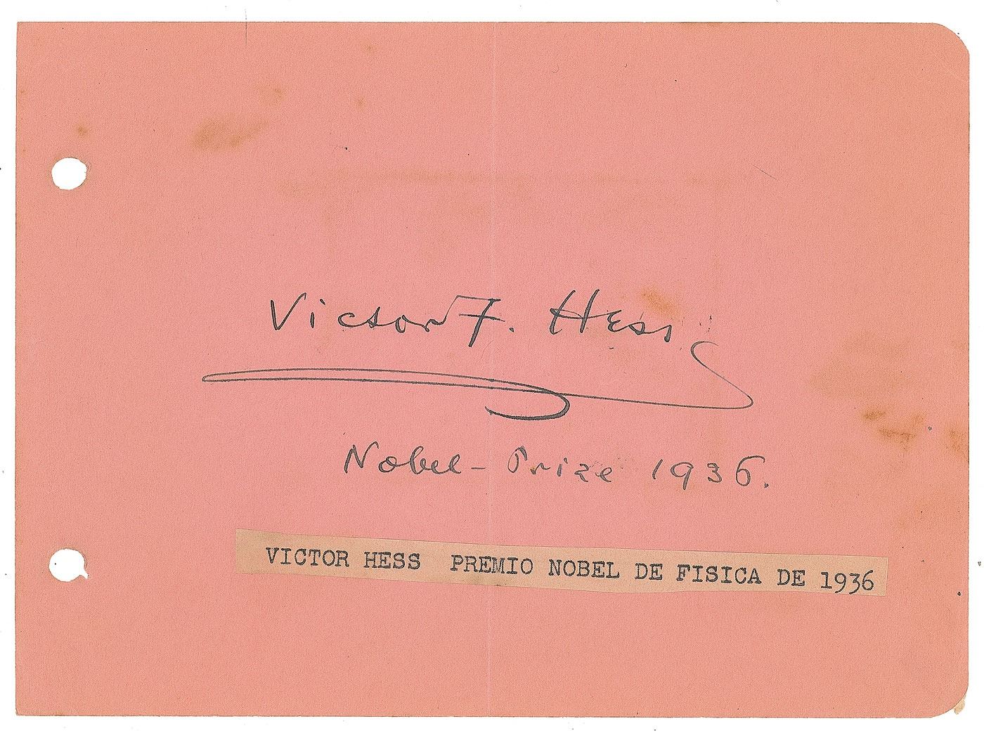 Fountain pen signature, “Victor F. Hess,” on a peach-colored 6.75 x 4.75 album page with an affixed caption. In very good to fine condition, with scattered stains and a central vertical fold.