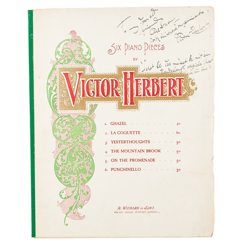 Softcover sheet music booklet for "No. 4, The Mountain Brook" from "Six Piano Pieces by Victor Herbert," published in Chicago by M. Witmark & Sons, seven pages, 11 x 13.75, signed and inscribed on the front in ink, "To my dear old friend Carl Stasny, with sincerest compliments, Victor Herbert," adding a brief statement in German below. In very good condition, with tears to the edges, some of which have been repaired with old clear tape.