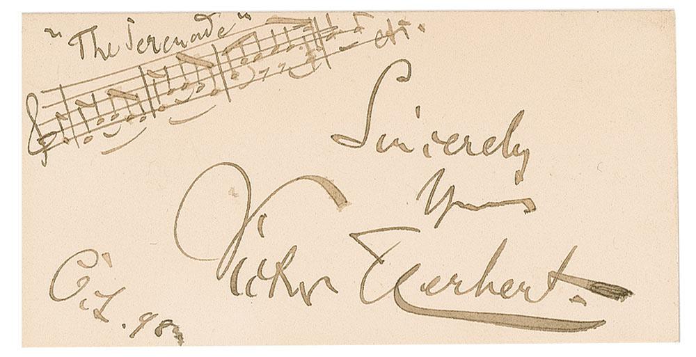 Composer (1859–1924) best known for such popular operettas as ‘Babes in Toyland’ and ‘Naughty Marietta.’ AMQS on a 3 x 1.5 off-white card. Herbert pens four elaborate bars from “The Serenade,” signed underneath, “Sincerely, Victor Herbert.” In fine condition, with quote extending to edge of card.
