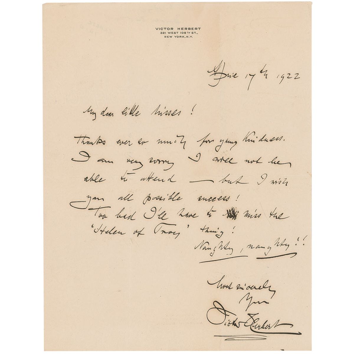 ALS, one page, 8.5 x 11, April 17, 1922. In a letter to his “dear little misses,” Herbert writes, in full: “Thanks every so much for your kindness. I am very sorry I will not be able to attend—but I wish you all possible success! Too bad I’ll have to miss the ‘Helen of Troy’ thing! Naughty, naughty!” In fine condition, with intersecting folds, with one passing through the first letter of the signature, and light creasing.
