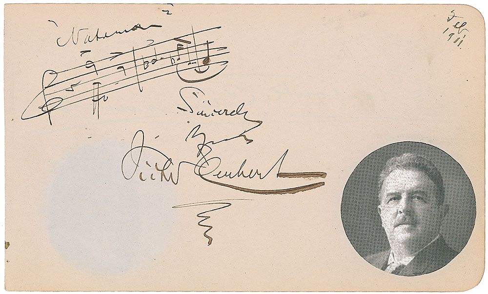 AMQS on an off-white 6.5 x 4 album page, signed at the conclusion, “Sincerely yours, Victor Herbert.” Herbert pens three bars from his opera “Natoma.” A well-placed magazine photo is affixed to the right side, with a collector’s date notation of February 1911 in the upper corner. In fine condition, with a subtle circular area of toning to the left side.