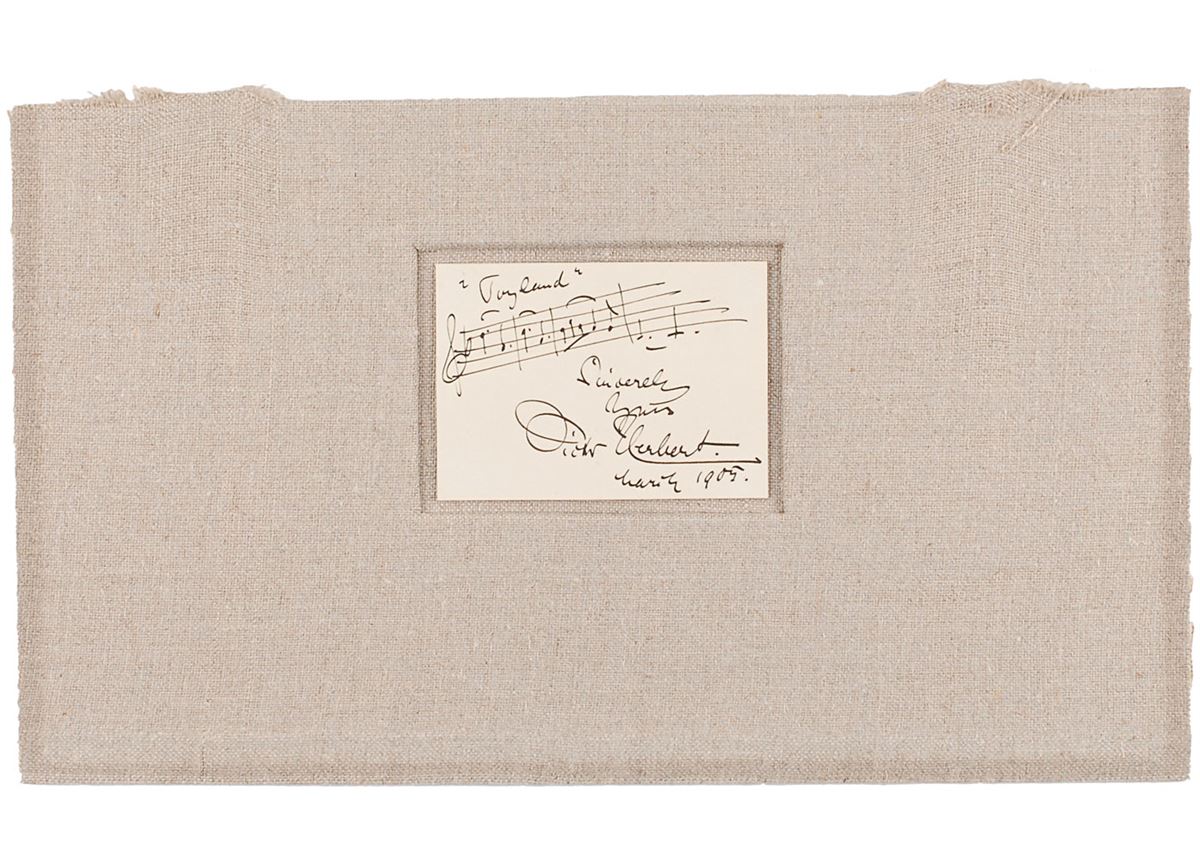 Composer, cellist, and conductor (1859–1924) known for his Broadway operettas and Tin Pan Alley tunes. AMQS on an off-white 3.25 x 2.25 card, signed below in bold black ink, “Sincerely yours, Victor Herbert, March 1905.” Herbert pens four bars of his classic “Toyland.” Affixed to a 12 x 7 cloth mount. In fine condition.