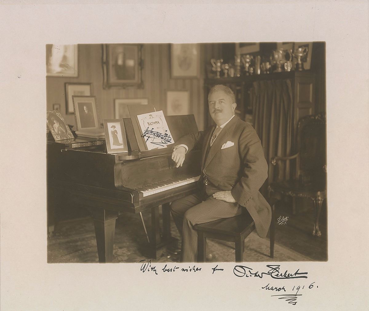 Crystal-clear matte-finish 12 x 10 photo of the composer sitting at his piano, boldly signed in the lower border in fountain pen, “With best wishes, from Victor Herbert, March 1916,” with the addition of a three-bar AMQS on the sheet music set on the piano. In fine condition. Scarce in oversized photos of this quality, particularly with the inclusion of this highly desirable musical quote.