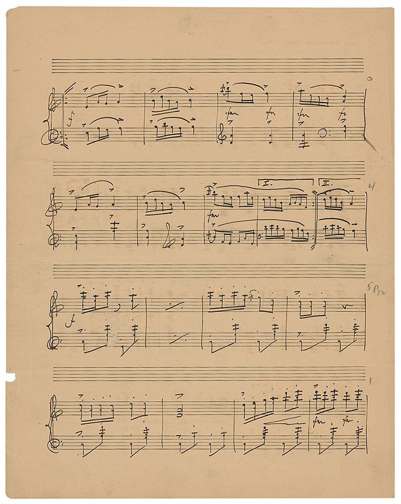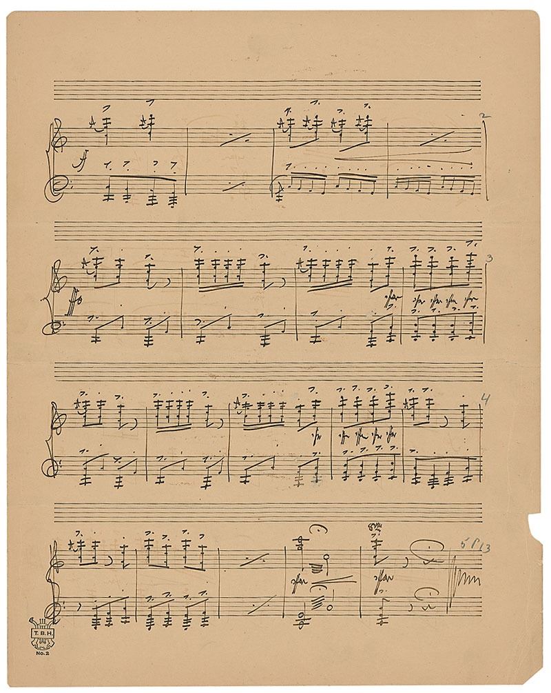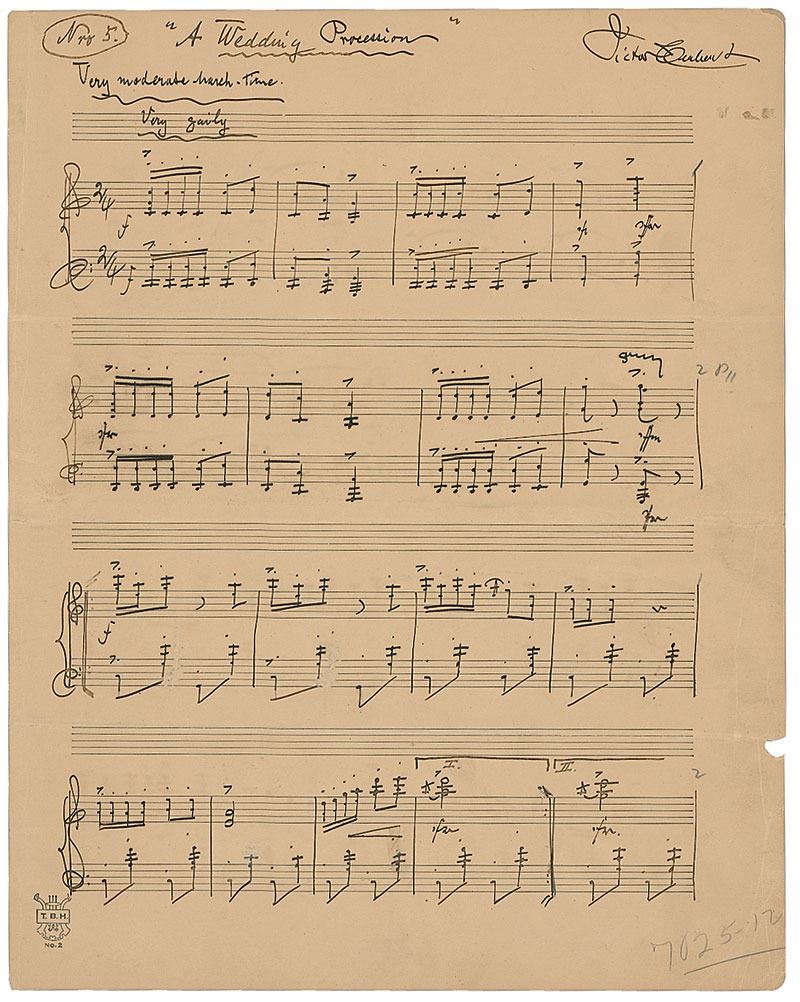 Handwritten musical manuscript for a work titled at the top by Herbert 'A Wedding Procession,' on three pages of two adjoined sheets of 10.25 x 13.5 musically-lined sheets. Herbert pens 52 bars of the instrumental composition, notating at the top, "Nr. 5. Very moderate march-time. Very gaily." Signed in the upper right of the first page, "Victor Herbert." Score is removably encapsulated in acid free Mylar. In very good condition, with horizontal folds, scattered creases, a bit of paper loss to edges, and a uniform shade of mild toning. Provenance: Christies, November 2002.