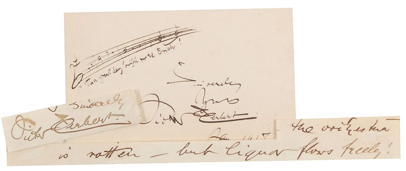 Three items: an AMQS on an off-white 5 x 3 card, with five bars of music and lyrics from his operetta 'Eileen,' dated January 1917 and reading, "'Tis a great day tonight for the Irish"; an ink signature, "Victor Herbert," on an off-white 3 x .75 slip clipped from the closing of a letter; and two handwritten lines "The orchestra is rotten-but liquor flows freely," on an irregular 8.5 x 1 slip, also clipped from a letter. In fine condition, with toning to all three pieces.