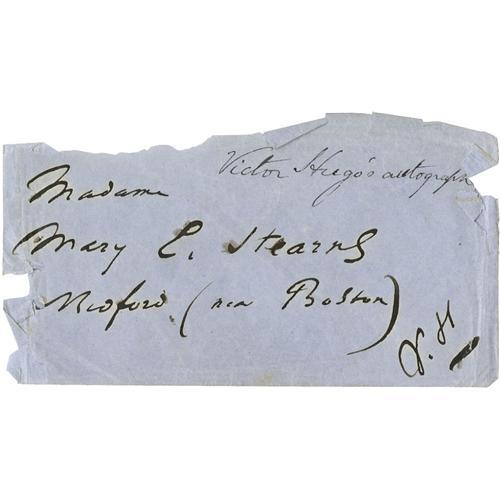 <B>Victor Hugo Autograph Envelope Addressed to a Boston Abolitionist</B></I> Autograph Envelope Signed ("V.H."), 5" by 2.5", no place or date. Boldly penned in dark ink on a blue envelope albeit ragged all on sides and containing, in the upper right corner a note in an unknown hand identifying the autograph as Hugo's. Comprised of four lines, as follows: "Madam / Mary E. Stearns / Medford (near Boston) / "V.H." Mrs. Stearns, celebrated for her glittering salon, was the wife of the wealthy Boston businessman and noted abolitionist, George Luther Stearns. From the Henry E. Luhrs Collection. Accompanied by LOA from PSA/DNA. <BR><BR><B>Important notice:</