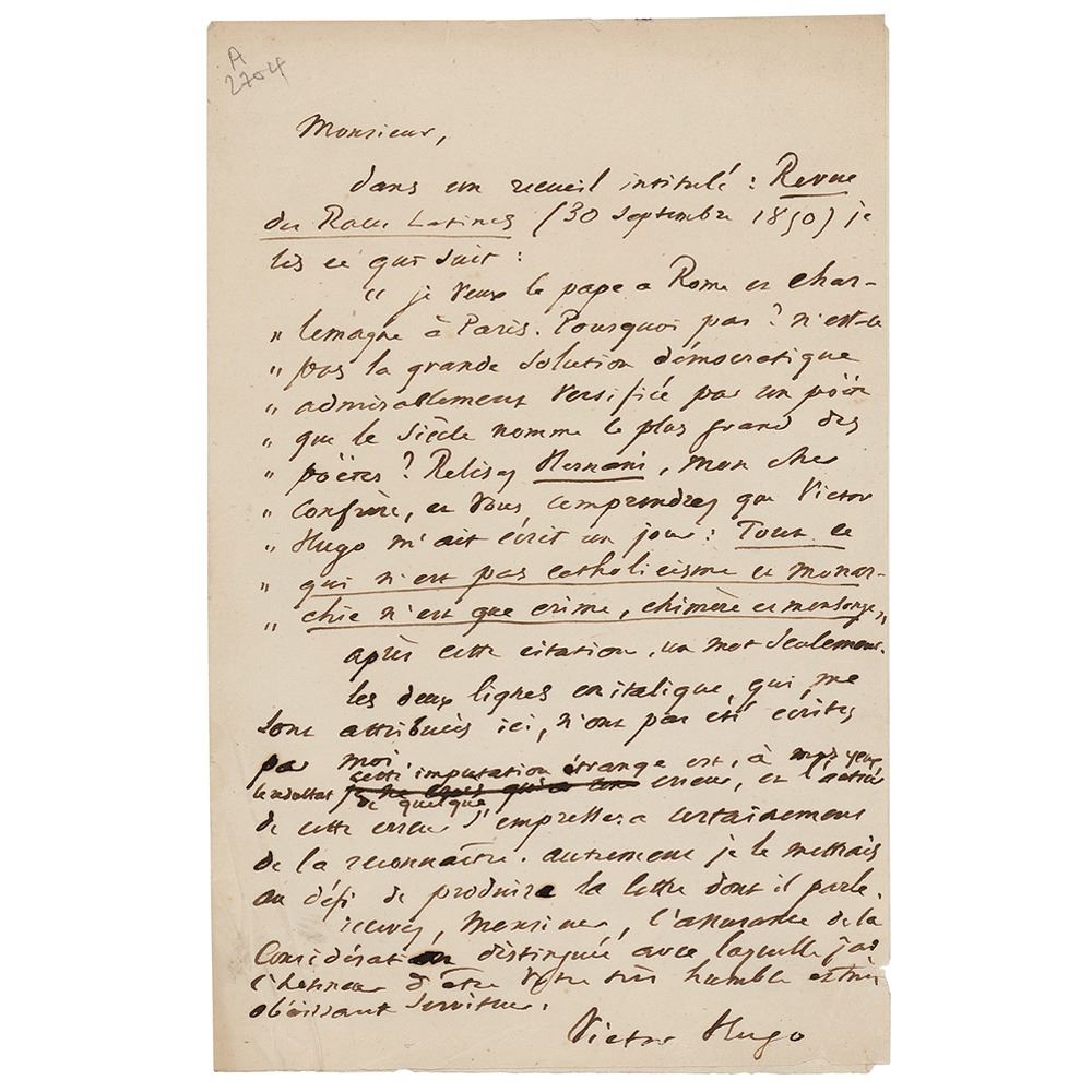 ALS in French, one page, 4.75 x 7.5, no date. Handwritten letter by the illustrious author, about religion and politics, and mentioning his most important play, 'Hernani.' In part (translated): "In a volume entitled Review of the Latin Races (30 September 1850), I read what the following: ‘I want the Pope in Rome and Charlemagne in Paris. And why not? Is it not the great democratic solution admirably put in verses by a poet which our century extols as the greatest among all poets? Read Hernani again, my dear colleague, and you will understand that Victor Hugo has once written to me: Everything which is not Catholicism and Monarchism is nothing but crime, daydreaming and fallacy.’ After this citation, only one word. These two lines, purported to be mine, have not been written by me. This bizarre attribution is, I think, the result of some mistake, and the author of this mistake will certainly very soon acknowledge it. Otherwise, I will challenge him to show the letter of which he writes about." In fine condition, with a few small tears and creases.