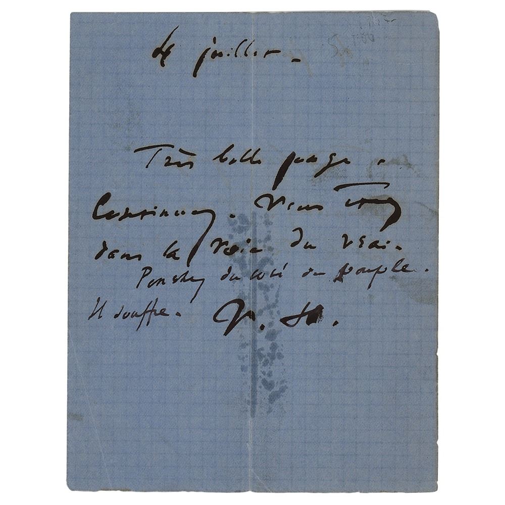 ALS in French, signed “V. H.,†one page, 4 x 5.25, July 4. Fabulous handwritten letter by the illustrious author, in full (translated): "Very beautiful page. Keep going. You are on the Way of Truth. Lean towards the people. They are suffering." In very good to fine condition, with staining along the central vertical fold.