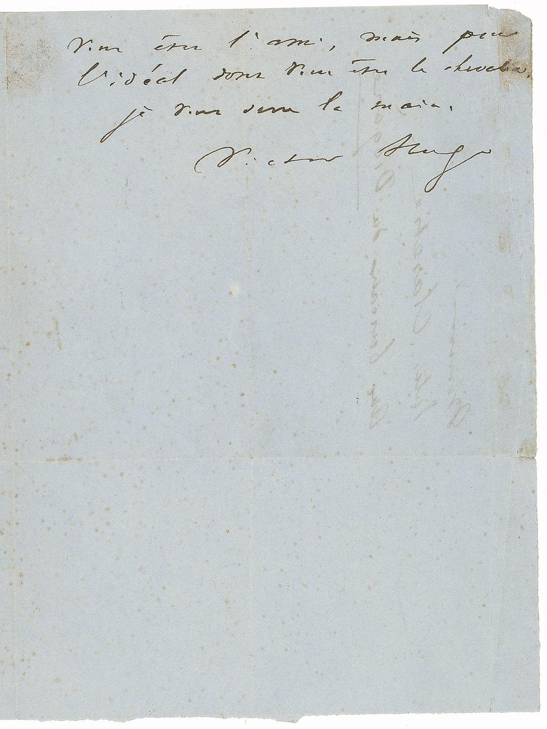 French writer, artist, and statesman (1802–1885) best known for such canonical novels as Les Misérables and The Hunchback of Notre Dame, and whose 1851 inflammatory writings denouncing Louis-Napoleon forced him into a two-decade exile. ALS in French, two pages, 4.25 x 5.75, June 5, [1862]. Letter to critic Jules Claretie about his favorable review of Les Miserable. In full (translated): “I have just read the last issue of Diogene. When a man creates, or tries to create, as I have, a work that is useful and honest in the face of, and in opposition to, the immense evil that governs the world, when hatred pursues him and he has become the focus of all the furies, he is grateful to those intrepid souls who fight at his side; but when those brave hearts also have beautiful and radiant minds, instead of just taking casual note of it, he is softened by it. This is the emotion that I am feeling. In the struggle for progress, you have supported me with your inspired thinking and your noble and generous style, in which all that is great, pure and true is reflected. I thank you, Sir, for this new and eloquent reflection of Les Miserables. I thank you for it, not for myself, not for the book, but on behalf of those who suffer, whose friend you are, and on behalf of an ideal whose champion you have been. I shake you by the hand.” Reverse of second page bears an address panel in Hugo’s hand. Intersecting folds, one through a single letter of signature, a few small edge tears and dings, small pencil notation at top, and some scattered light toning and wrinkling, otherwise fine condition.
