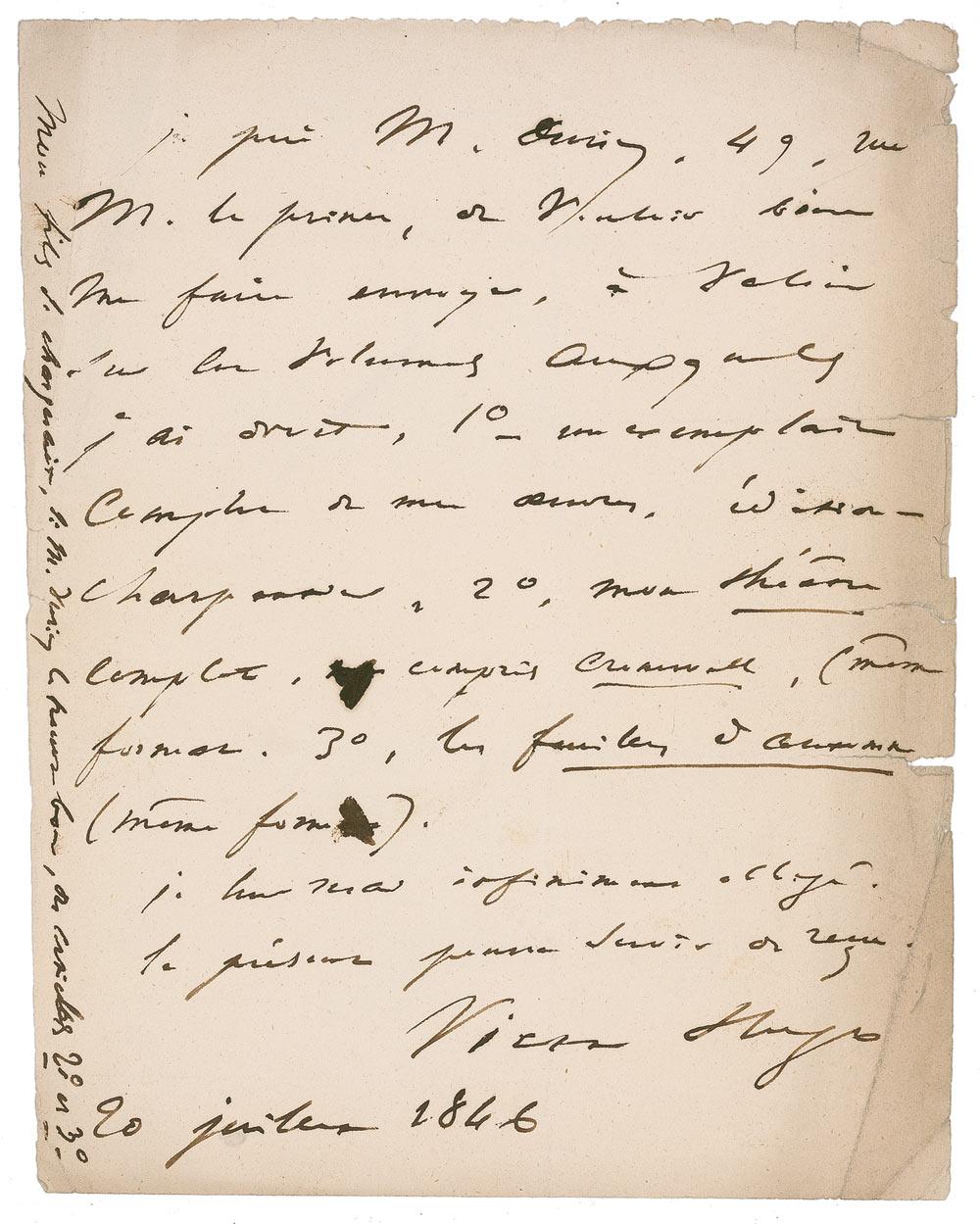 ALS in French, one page, 7 x 9, July 20, 1846. Letter to an unidentified recipient. In part (translated): “I pray M. Duriez…to send me, from my quota of volumes: 1. One complete set of my books, Charpentier Edition. 2. My complete Theatre including Cromwell (same format). 3. Les Feuilles d’automne (same format) I’ll be much thankful. This document can be used as receipt.” In very good condition, with intersecting folds, one through a single letter of signature, scattered toning, creasing and soiling, and scattered small edge tears and separations. Hugo’s writing is clear and quite dark.