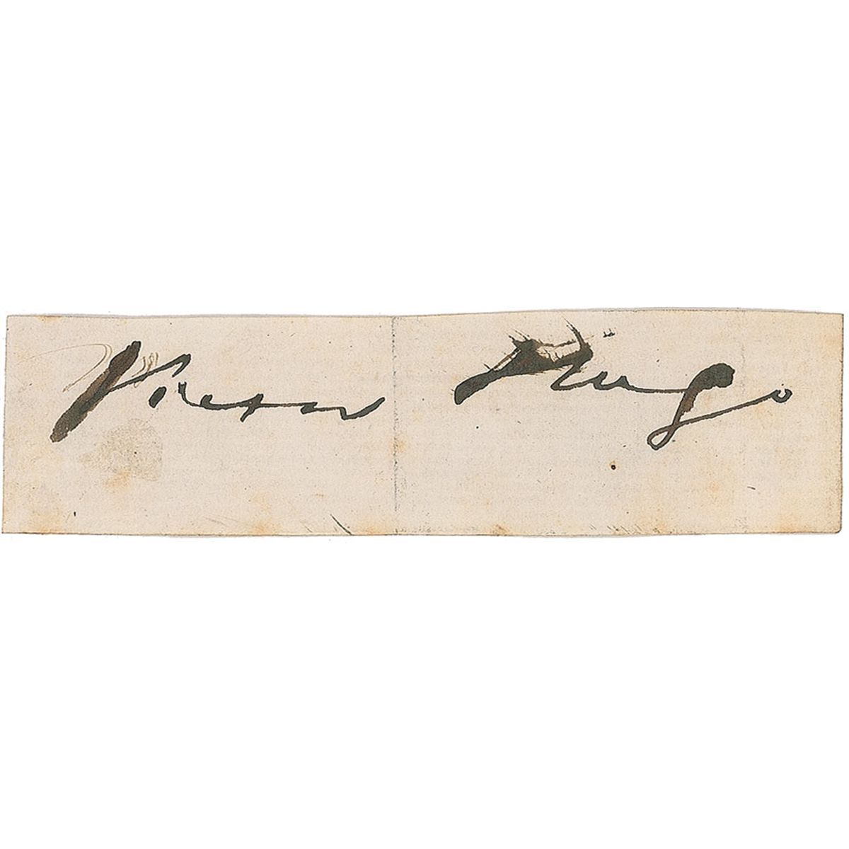 Ink signature, “Victor Hugo,” on an off-white 3.25 x .75 slip. In very good condition, with a central vertical fold, scattered toning and soiling, and a couple ink blots and brushes to signature. Accompanied by an original unsigned carte-de-visite portrait of Hugo by Anatole Pougnet of Paris.