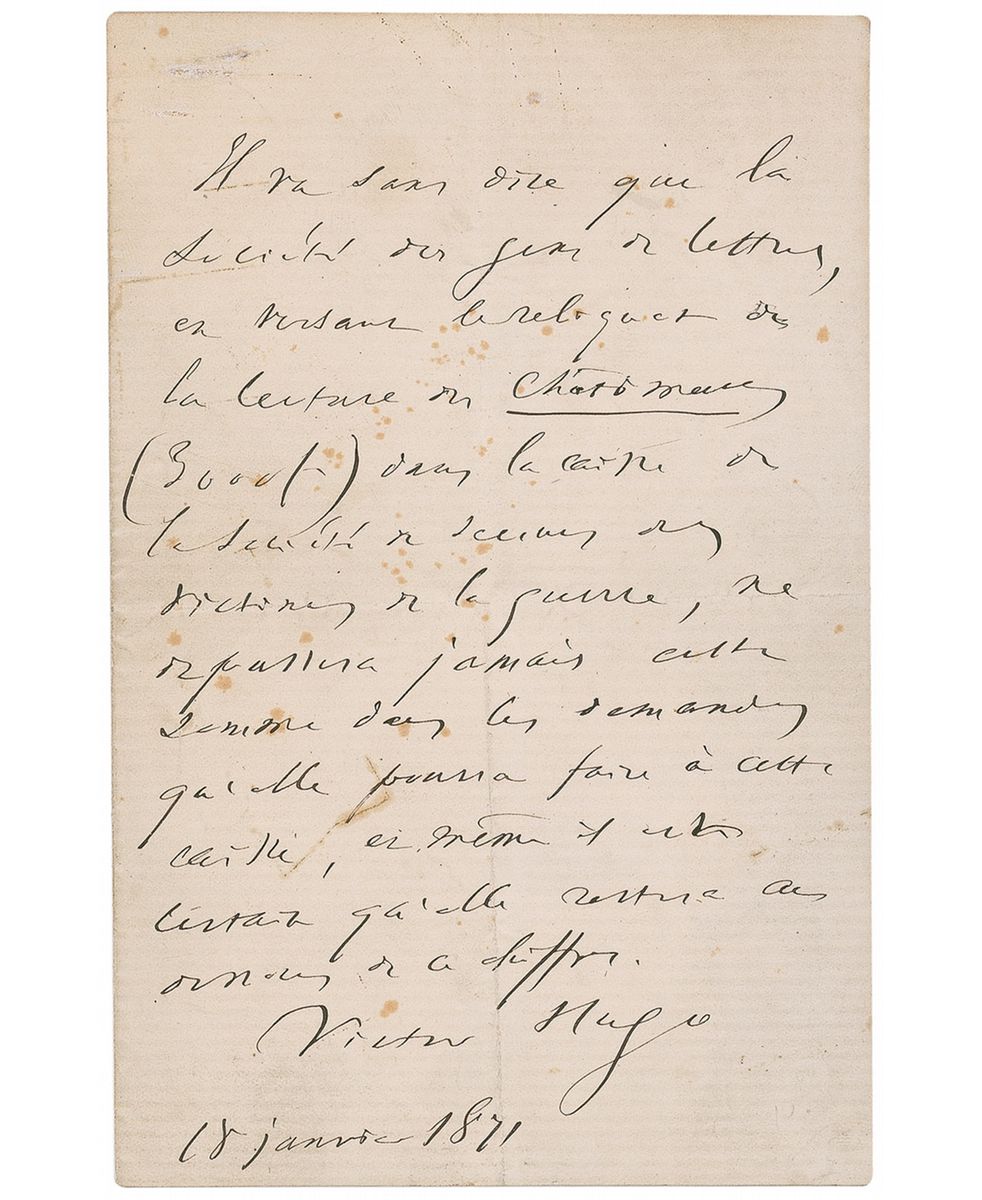 ALS in French, one page, 4.5 x 6.75, January 18, 1871. Letter to an unidentified recipient. In full (translated): “It goes without saying that the Authors' Society, by paying 3,000 francs, the remainder from the reading of Les Chatiments, to the fund of the Society for assistance to victims of the war, will never surpass that sum in the requests that could be made of that fund and it is even certain that it will remain inferior to that figure.” In very good condition, with central horizontal and vertical fold, some scattered spotting and soiling, a few stray marks, and a small hole to top left. Les Chatiments is a collection of poems fiercely attacking Napoleon Ill's Second Empire. On Jan. 19, one day after this letter, Hugo was elected a deputy to the National Assembly.