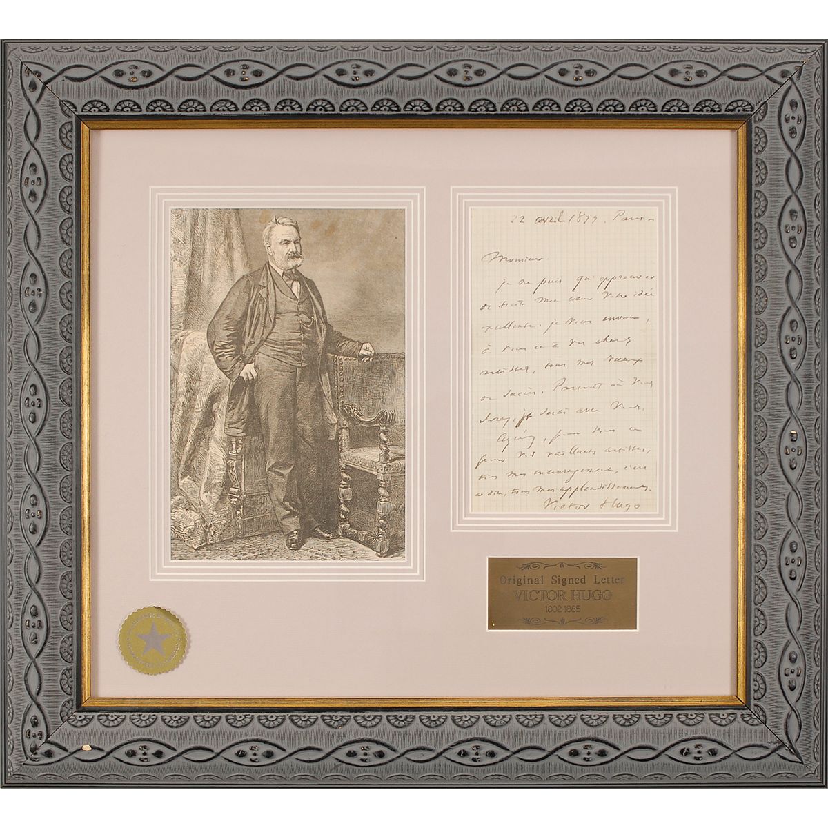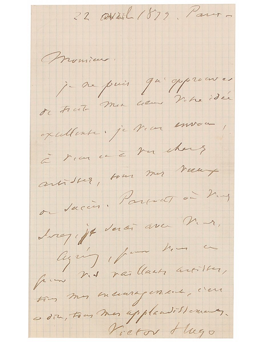 Important French writer, artist, and statesman (1802–1885) best known for such canonical novels as Les Misérables and Notre-Dame de Paris (aka The Hunchback of Notre Dame). Much of his literary output was devoted to political and social issues, and in the 1840s he became actively involved in the French government as a legislator and staunch activist on behalf of the Republican cause. In 1851 the controversy surrounding his inflammatory writings denouncing Louis-Napoléon forced him into a two-decade exile, during which his productive creative pace barely slackened. ALS in French, one page, lightly-lined graph-like paper, 4.5 x 7.75, April 22, 1879. Letter to an unidentified gentleman. In full (translated): “I only can agree with all my heart your excellent idea. I am sending to you and to your dear artists’ all my wishes of success. Anywhere you will be, I will be with you. Accept for you and your valiant artists all my encouragements. I will say all my applauses.” Quadruple matted and framed with a full-length portrait of Hugo and a small plaque to an overall size of 21.5 x 19.5. Central horizontal and vertical fold, some light toning and soiling to edges, lightly affecting signature, and a diagonal crease to lower right, otherwise fine condition.
