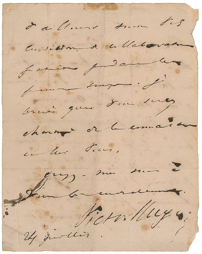Important French writer, artist, and statesman (1802–1885) best known for such canonical novels as Les Misérables and Notre-Dame de Paris (aka The Hunchback of Notre Dame). Much of his literary output was devoted to political and social issues, and in the 1840s he became actively involved in the French government as a legislator and staunch activist on behalf of the Republican cause. In 1851 the controversy surrounding his inflammatory writings denouncing Louis-Napoléon forced him into a two-decade exile, during which his productive creative pace barely slackened. Partial ALS in French, one page both sides, 5.75 x 7.25, no date. Final two pages of a longer letter written to a newspaper editor. Translated in full: “You have requested from me, sir, two literary authors. Here is one of them: Mr. Leon Masson that you will be able to employ both in the literary section as well as in the political pages of your newspaper. He is a young man full of talent and ideas who will prove a worthy collaborator as soon as he meets you. I believe you will be delighted with him as he will be with you.”Intersecting folds, several passing through signature, scattered toning and foxing, tape remnant to top edge, some light pooling of ink and stray ink marks, and a rough vertical edge, otherwise very good condition. Based on Hugo’s handwriting, this early letter can be dated to the 1830’s, the start of his literary career.