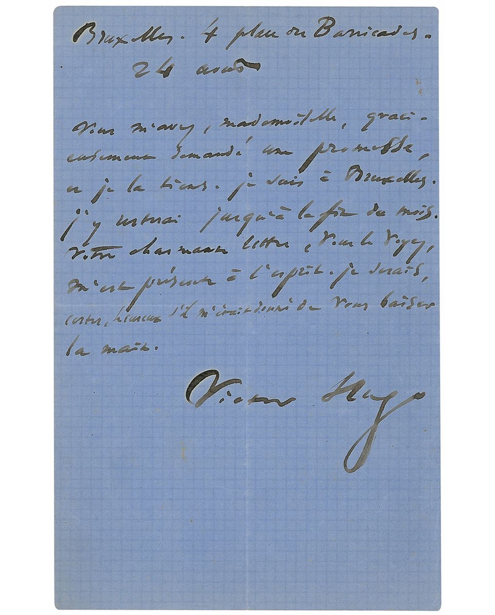 ALS in French, one page, lightly-lined graph paper, 5.25 x 8.25, August 24, no year. In part (translated): “You graciously asked me for a promise, Mademoiselle, and I keep it. I’m in Brussels. I’ll stay here till the end of the month. You see, your charming letter is present in my mind.” Central vertical and horizontal folds, the vertical fold passing between letters of the signature, scattered creases, and a few spots of soiling, otherwise fine condition.