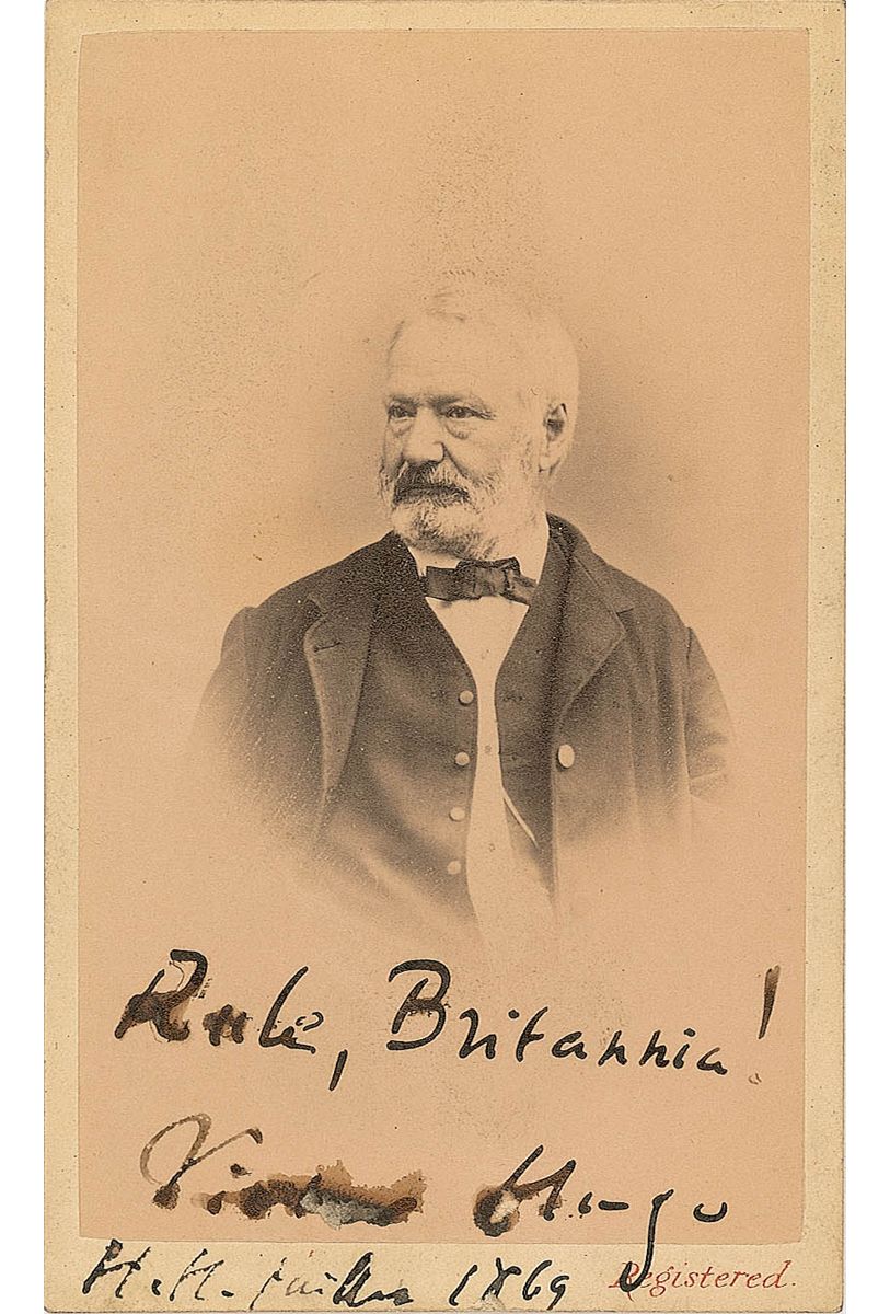 Original 2.5 x 4 carte-de-visite portrait of Hugo, by Garnier Arsene of Guernsey, signed at the bottom of the image, “Rule, Britannia! Victor Hugo,” as well as a location and date in the lower border. Affixed to an off-white 3.75 x 5.25 sheet. A diagonal crease, heavy spreading to the ink in the signature, and a tiny adhesive remnant affecting part of his first name, otherwise very good condition. Hugo adopted Guernsey as home during his 15-year exile from France (1855–1870), which explains his exuberant exaltation of the Crown. This was one of his most productive periods, publishing Les Miserables in 1862.