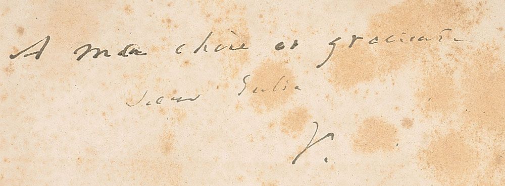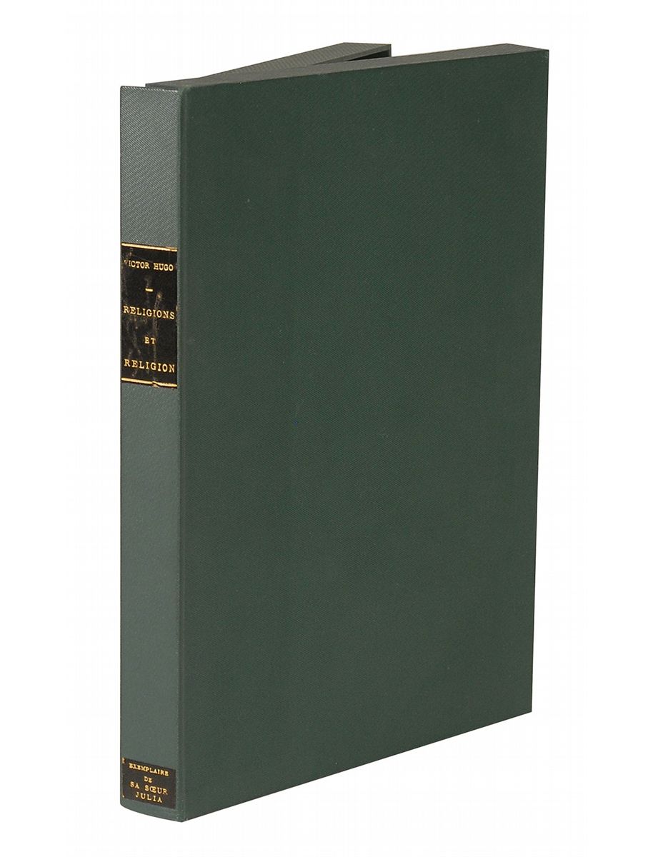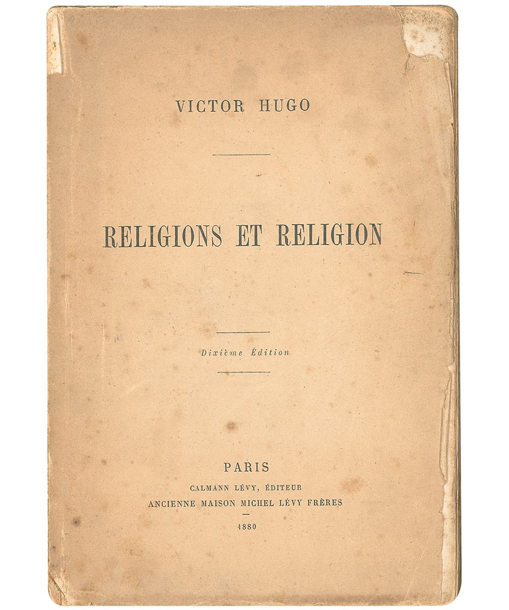 Signed book: Religions et Religion. Diexieme edition. Paris: Calmann-Lévy, 1880. Softcover, 6.25 x 9, 141 pages. Signed and inscribed to his sister-in-law on the first free end page, “A ma chere et gracieuse soeur Julie, V.” Autographic condition: heavy foxing and a pencil notation to the signed page, otherwise very good. Book condition: P/None. Off-white wraps; chips, tears, and creases along edges; spine cracked in several places, separated entirely at central gathering and nearly separated at two others; heavily foxed and lightly soiled; yellowed; small rectangular discoloration inside front cover. In VG+ green cloth-covered case.