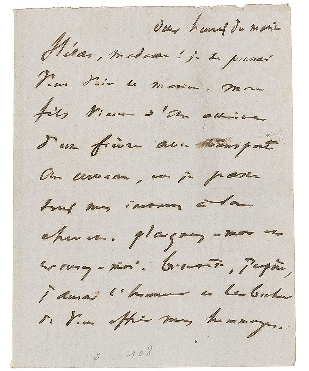 Unsigned autograph letter in French, one page, 4 x 5.25, no date, but Paris circa 1872. A carefully penned letter written at two in the morning, to a female friend, “Alas, Madame, I will not see you this morning. My son has just been affected by a fever that has gone to his brain and I spend every moment next to his bed. Please excuse me and pray for me. Soon, I hope, I will have the honour and the happiness of presenting you my hommages.” A professionally repaired tear to the upper right quadrant, otherwise fine condition. Hugo’s last surviving son, François-Victor, fell ill in 1872 and lingered for over a year to die in December 1873. Although apparently written in a formal style, it is very possible that this letter is addressed to his longtime lover Juliette Drouet, whom Hugo continued to address formally during their intense and intimate correspondence of over forty years (which would explain the lack of a signature).
