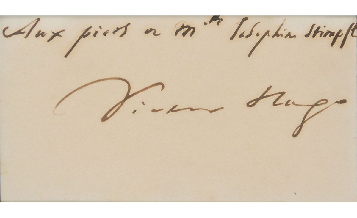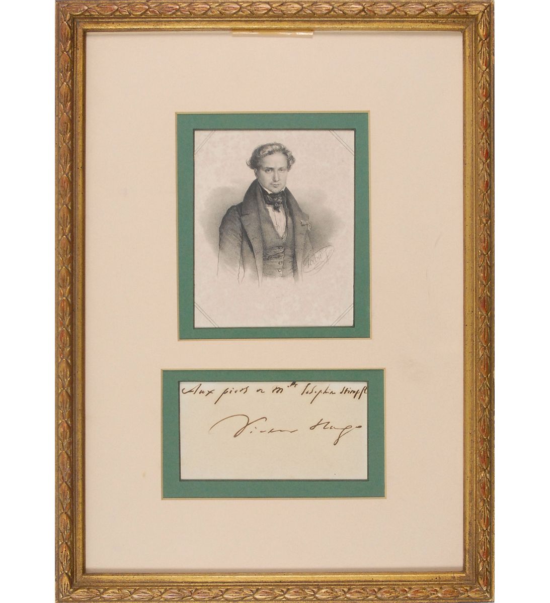 Renowned French writer best known for Les Miserables (1802–1885). Beautiful ink signature and inscription in French on an off-white 4.5 x 2.5 slip. Nicely double-matted and framed with an engraved portrait to an overall size of 11 x 15. In fine condition.