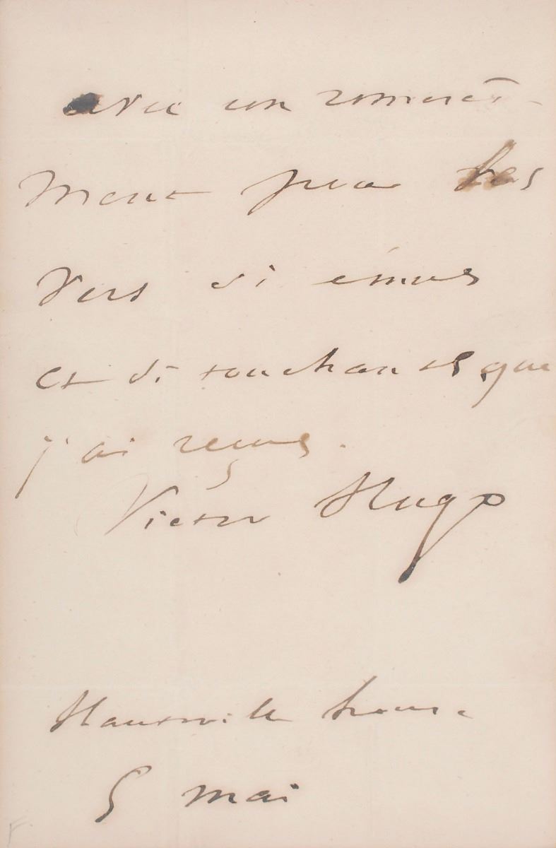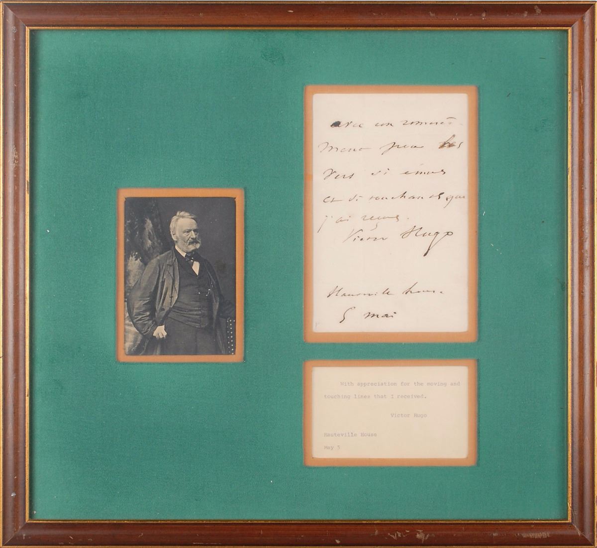 ANS in French, one page, 4.75 x 7.25, May 5, no year. Addressed from Hauteville House, in full (translated): “With appreciation for the moving and touching lines that I received.” Double-cloth-matted with a full English translation and image of Hugo to an overall size of 17.75 x 16.5. Intersecting folds (two vertical folds passing through portions of the signature), spreading to a few letters of the writing, and slight creasing, otherwise fine condition. An exceptionally bold signature from one of the most celebrated scribes of the Romantic movement.