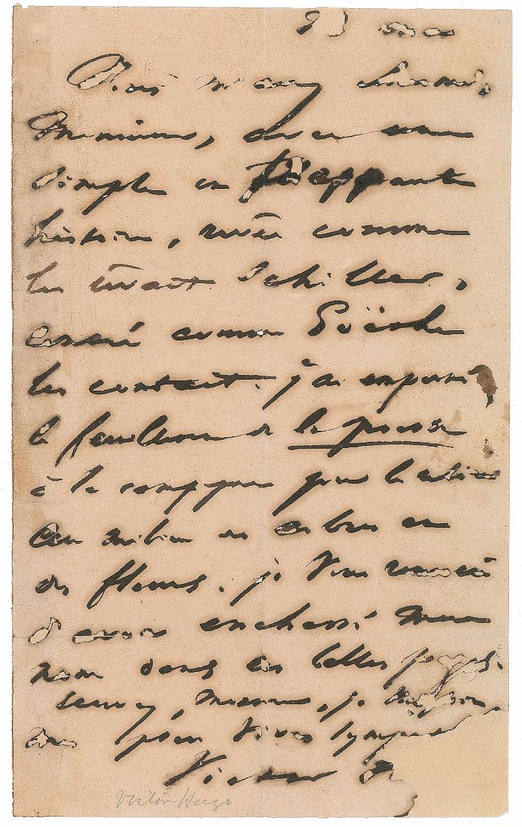 ALS in French, signed “Victor H,” one page, 4 x 9.5, January 3, 1865. In full (translated): "You have charmed me sir, with a simple and frightening story, dreamt as Schiller could have dreamt it, told as Goethe told stories. I have taken the journal Feuilleton de la Presse to my country house to read it again under the shadows of the trees and the flowers. I thank you for having inserted my name in these beautiful pages. Please receive sir, my most cordial sympathy.” Restored to very good condition, with intersecting folds, repaired paper loss to the lower right corner obliterating his last name, and many areas of repaired ink erosion to words and letters throughout. An important and beautiful letter referencing two of the most influential German writers of all time—Schiller the dreamer and Goethe the story-teller.