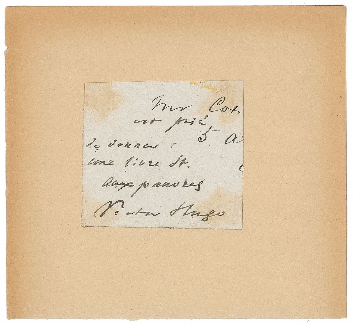 ANS in French, one page, 2.25 x 2, no date. Interesting note, in full: “Est prie, de donner une livre aux pauvres [It is requested to give a book to the poor].” Apparently clipped from a letter and affixed to a larger album page. In very good to fine condition, with mounting stains to corners. Excellent content from the charitable author.