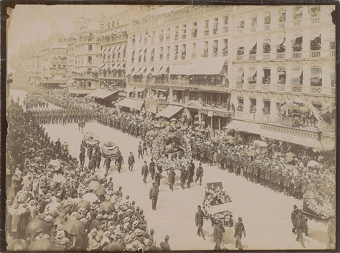 Rare original 9.5 x 7.25 albumen photo of the famous funeral procession of Victor Hugo, attended by more than two million people on June 1, 1885 in Paris. Lower right corner bears a Kuhn of Paris blindstamp. In very good condition, with overall creasing and wrinkling.