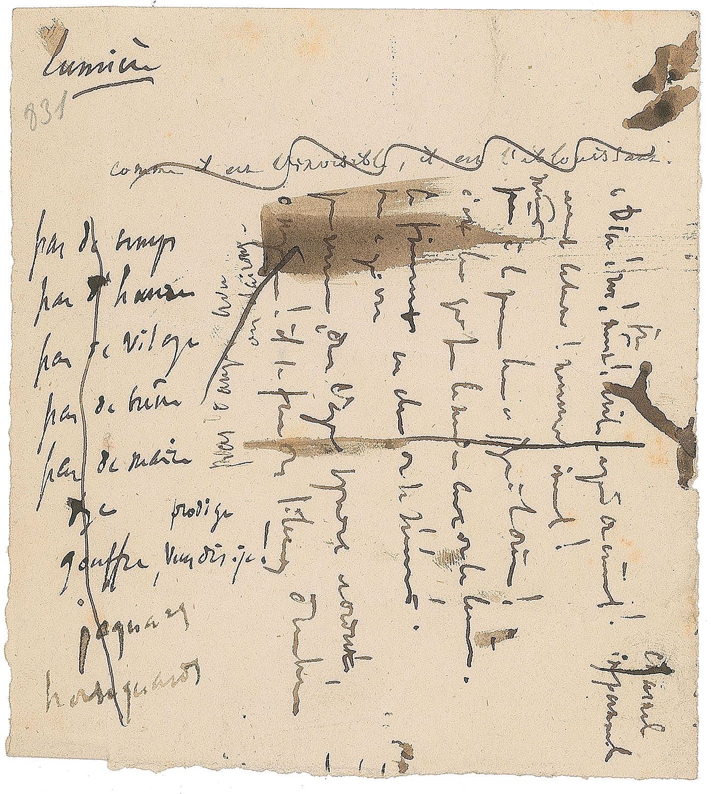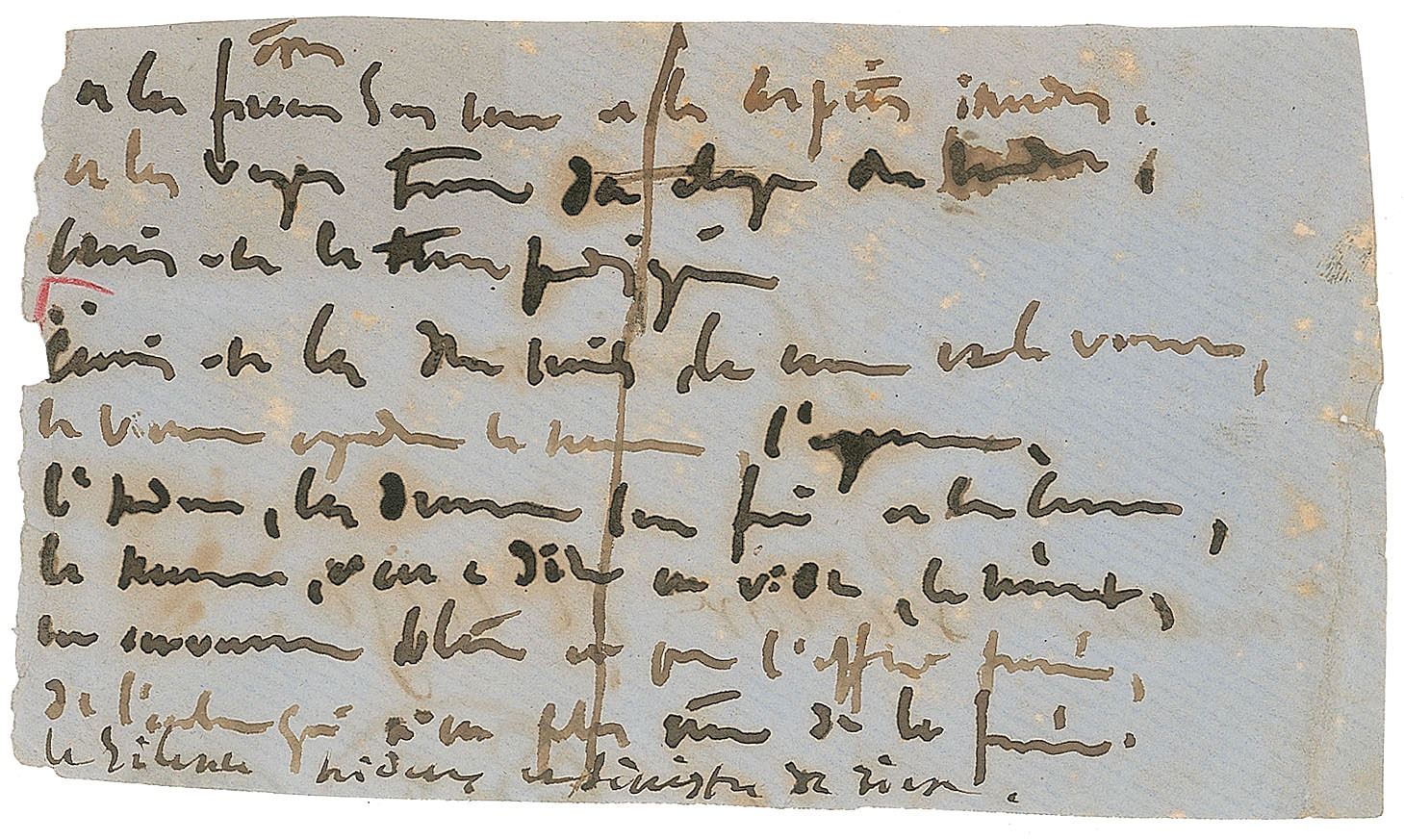 Interesting pairing of handwritten poetry drafts by Hugo, each struck through. The first, accomplished on the reverse of a 5 x 2.75 envelope panel addressed to him, was later revised and integrated into Religions et religion (IV, Des voix), published in 1880, and reads, in part (untranslated): "Connais-tu les deux nuits, la mort et la vivante, La vivante engendrant le monstre, l’e´pouvante, L’hydre, les de´vorant sans fin et les cre´ant, La morte, c’est-a`-dire un vide, le ne´ant." The second, accomplished on an off-white 4.75 x 4.25 sheet, was printed with variations in Dieu (II L’oce´an d’en haut, VI, 1891): "O^ Dieu! roi! mai^tre! asile! espoir du criminel! E´ternel laboureur! Moissonneur e´ternel! Pe`re a` la premie`re heure et juge a` la dernie`re!" In overall very good to fine condition. Accompanied by an export certificate from the French Ministry of Culture.