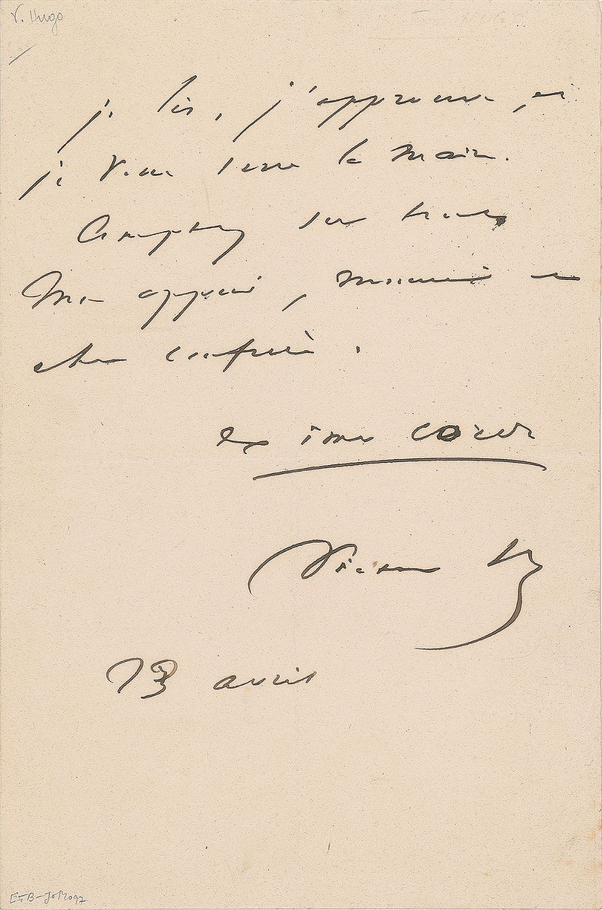 ALS in French, signed “Victor H.,” one page, 5.25 x 7.75, April 23, [no year]. Letter to his close friend, the French poet Alfred de Vigny, in full (translated): "I read, I approve and I shake your hand. Believe me with all my support, sir and dear colleague. From the bottom of my heart." In fine condition. Accompanied by a full letter of authenticity from PSA/DNA. This letter may date to 1845, when de Vigny was elected to the Academie francaise after several failed attempts.