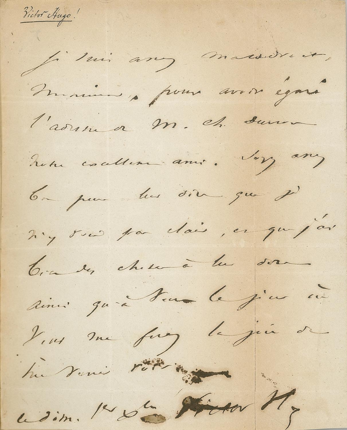 Important French writer, artist, and statesman (1802–1885) best known for such canonical novels as Les Miserables and Notre-Dame de Paris (aka The Hunchback of Notre Dame). Much of his literary output was devoted to political and social issues, and in the 1840s he became actively involved in the French government as a legislator and staunch activist on behalf of the Republican cause. In 1851 the controversy surrounding his inflammatory writings denouncing Louis-Napoleon forced him into a two-decade exile, during which his productive creative pace barely slackened. ALS in French, one page, 5.25 x 6.5, October 1, tipped into a copy of Chastelard by Algernon Swinburne, dedicated to Hugo. In full (translated): “I am rather clumsy, Monsieur, for having lost the address of Monsieur Charles [Duron (?]), our excellent friend. Be good enough to tell him that my eyesight is not very good, and I have a lot of things to tell him as well as at the day when I will [actually] see him. You will give me joy [make me happy] to come and see me.” In very good condition, with mild toning, several intersecting folds, substantial (repairable) separation at the top and bottom along a fragile vertical fold, and bleeding of the ink to his signature. Wonderfully personal content from the titan of French literature. On occasion, Hugo would use his eyesight as an excuse to fall back on. It is said he aggravated this problem by staring directly at the sun at times, resulting in permanent damage.