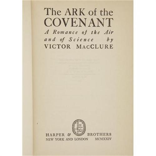 <B>Victor MacClure. </B></I><B><I>The Ark of the Covenant</B></I></B></I><B>.</B></I> New York: Harper and Brothers, 1924.<BR> <BR>First edition. Octavo. 414 pages.<BR><BR>Publisher's green cloth with titles in yellow on the spine and front board. Light shelf wear. Contents slightly toned especially at the preliminary pages. Former owner's name in pencil on the front free endpaper. Dust jacket bright with chipping at the corners and head and foot of the spine. Very good. <I>From the Robert and Diane Yaspan Collection.</B></I><BR><BR><b>Shipping:</b> Books & Catalogs (<a target="_blank" href="http://www.heritageauctions.com/common/shipping.php">view shipping information</a>)