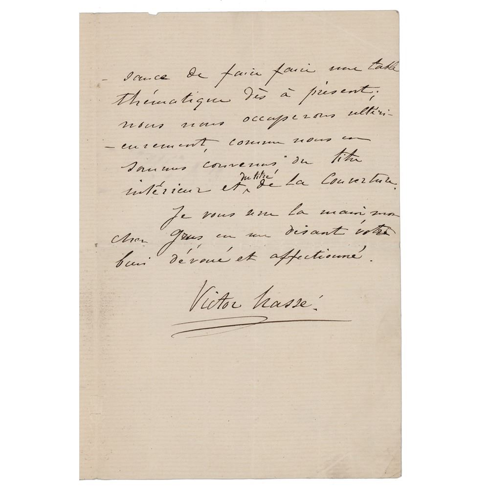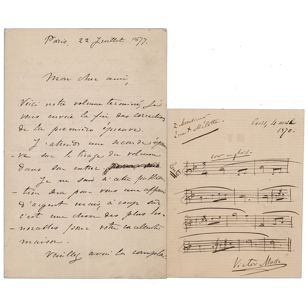 French composer (1822–1884) who won the Prix de Rome in 1844. Two items: an AMQS, one page, 4 x 5, April 4, 1870, signed and inscribed in fountain pen, “A Monsieur Ernest Melotte, Victor Masse,” who adds 11 neatly penned bars of music from an unknown piece of music; and an ALS in French, signed “Victor Masse,” one page both sides, July 22, 1877, an untranslated handwritten letter to a friend. In overall fine condition.