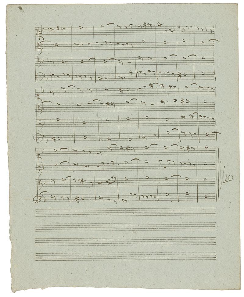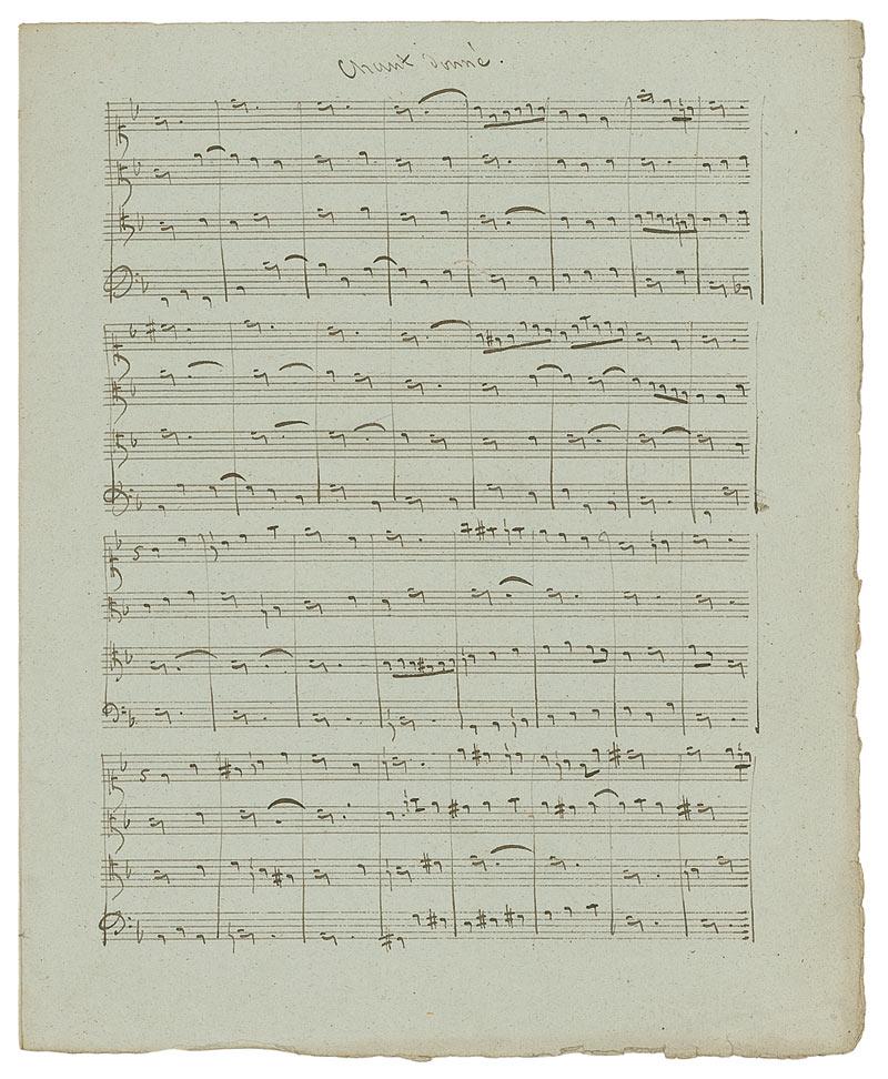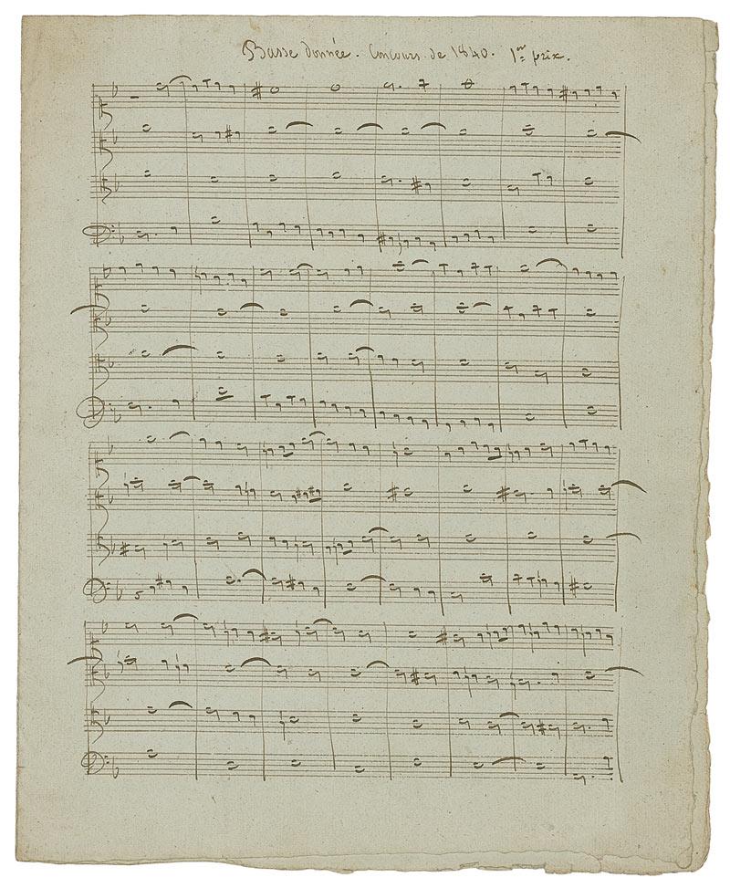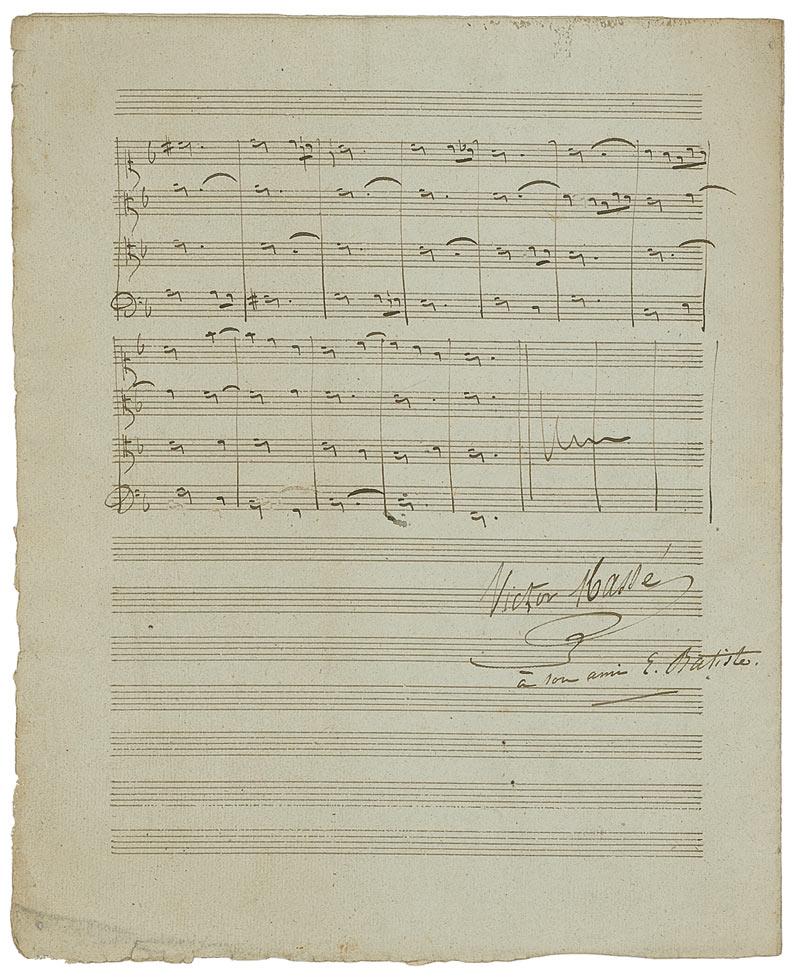 French composer (1822–1884) who won the Prix de Rome in 1844. Exceptional presentation musical manuscript on four sides of two adjoining 9 x 11.25 musically-lined pages. Titled at the top, “Basse donnée. Concours de 1840. 1er prix,” Masse pens 100 detailed bars of music, signing at the conclusion, “Victor Massé-a son Ami E. Batiste.” Scattered light toning and soiling, as well as overall light edge wear, otherwise fine condition.