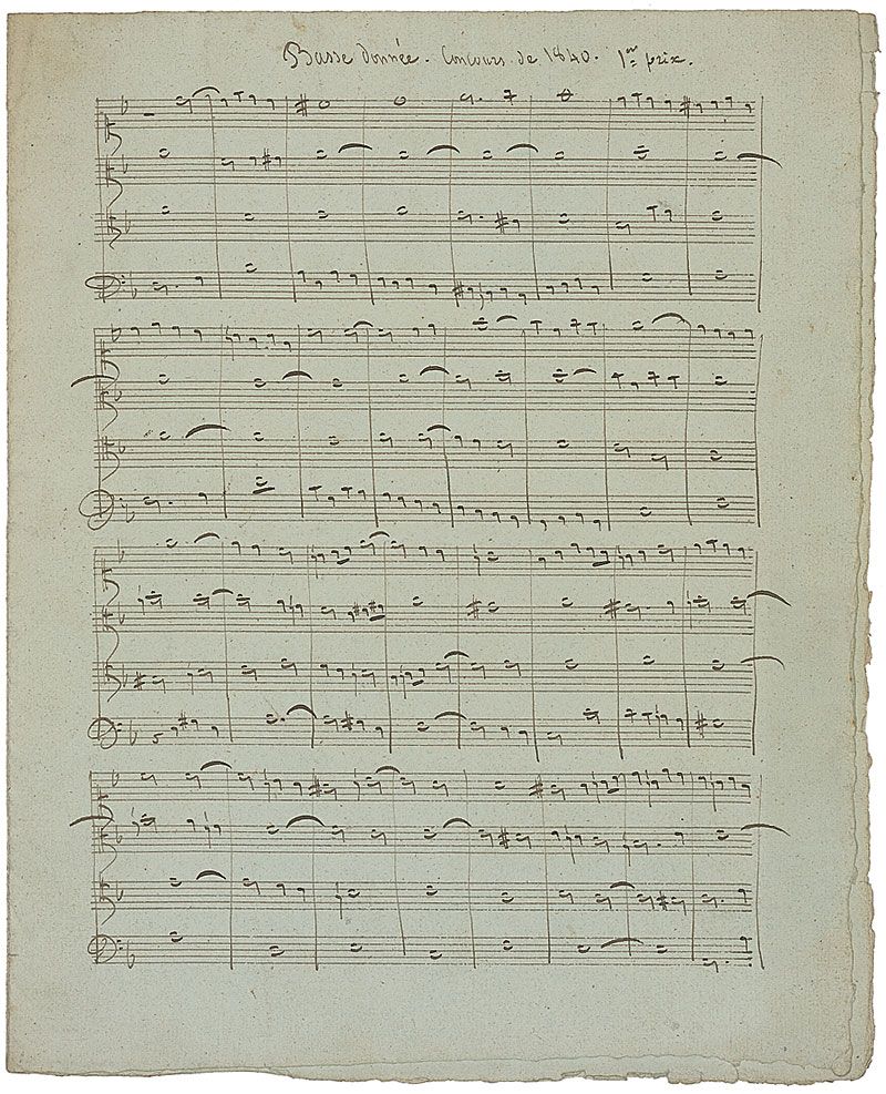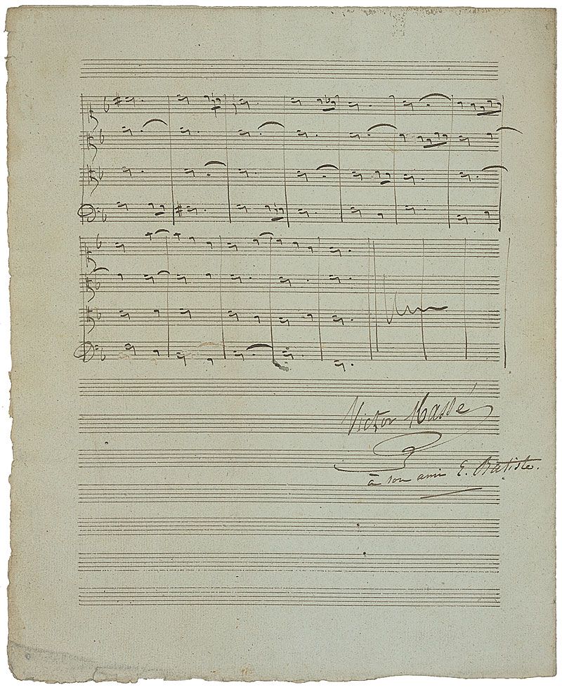 French composer (1822–1884) who won the Prix de Rome in 1844. Exceptional presentation autograph musical manuscript, four pages on two adjoining 9 x 11.25 musically-lined sheets. Titled at the top, “Basse donnée. Concours de 1840. 1er prix,” Masse pens 100 detailed bars of music, signing at the conclusion, “Victor Massé—a son ami E. Batiste.” In fine condition, with light scattered soiling.