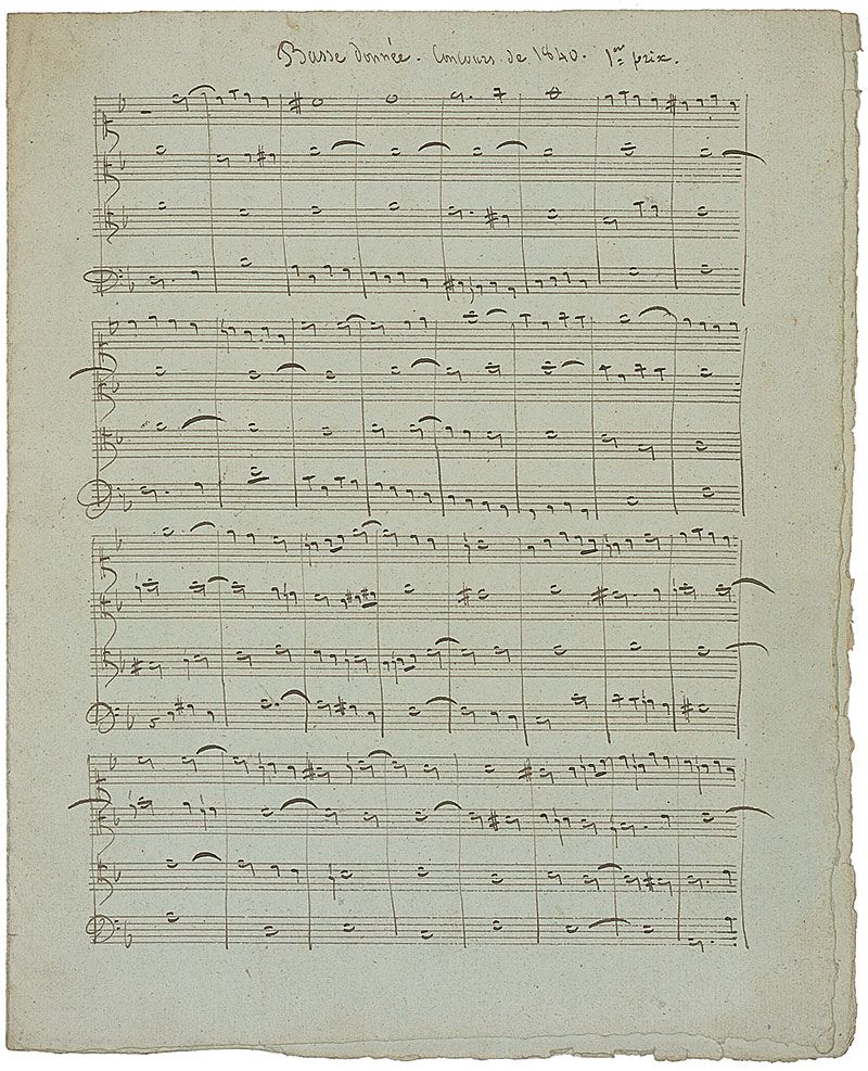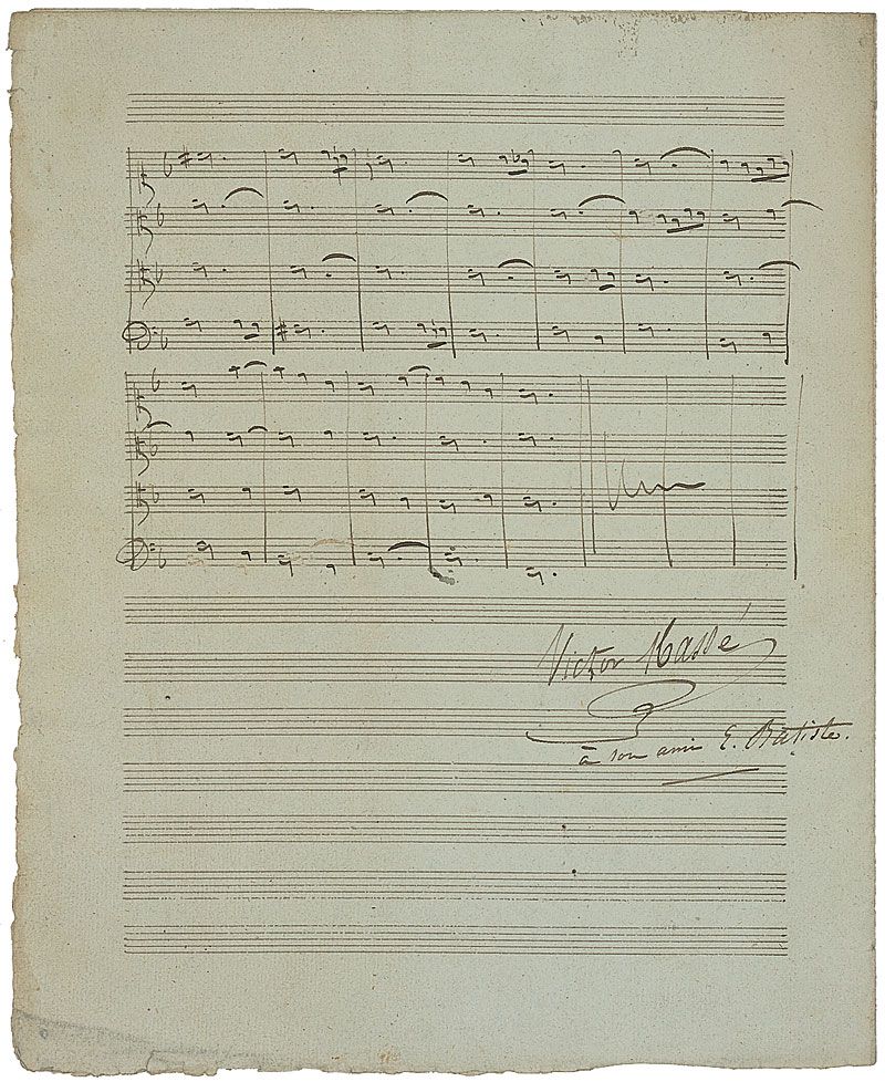 French composer (1822–1884) who won the Prix de Rome in 1844. Exceptional presentation autograph musical manuscript, four pages on two adjoining 9 x 11.25 musically-lined sheets. Titled at the top, “Basse donnée. Concours de 1840. 1er prix,” Masse pens 100 detailed bars of music, signing at the conclusion, “Victor Massé—a son ami E. Batiste.” In fine condition, with light scattered soiling.