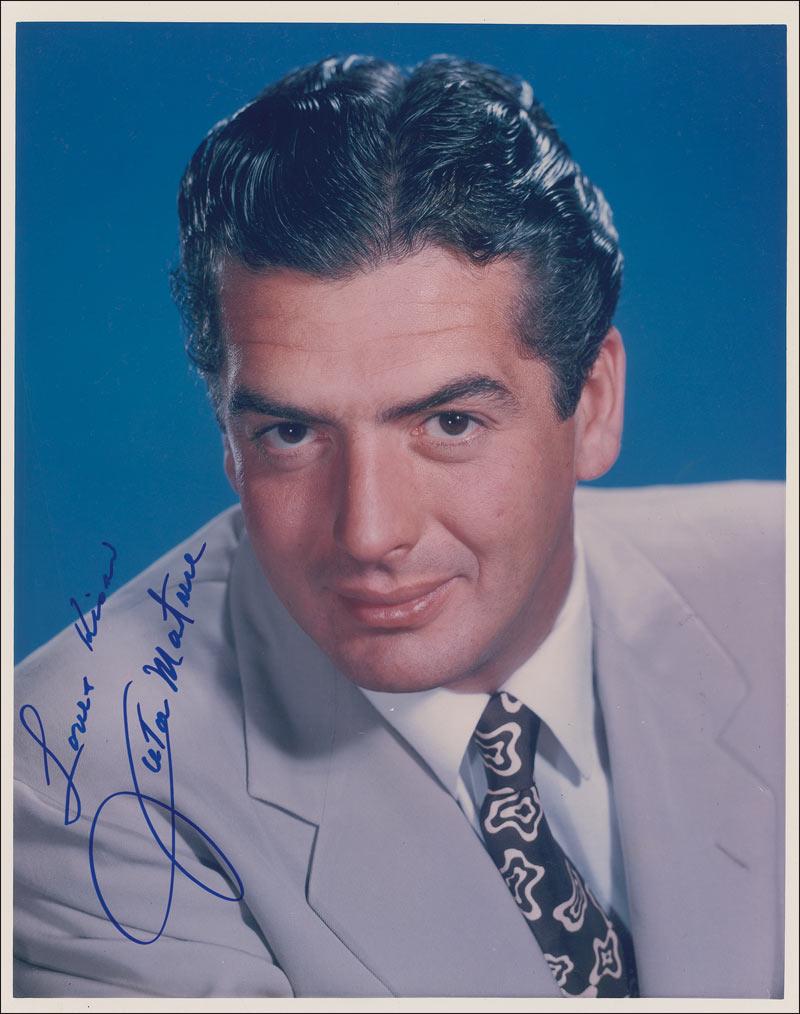Handsome color glossy 8 x 10 head-and-shoulders photo, signed vertically in blue felt tip, “Love & kisses, Victor Mature.” In very fine condition.
